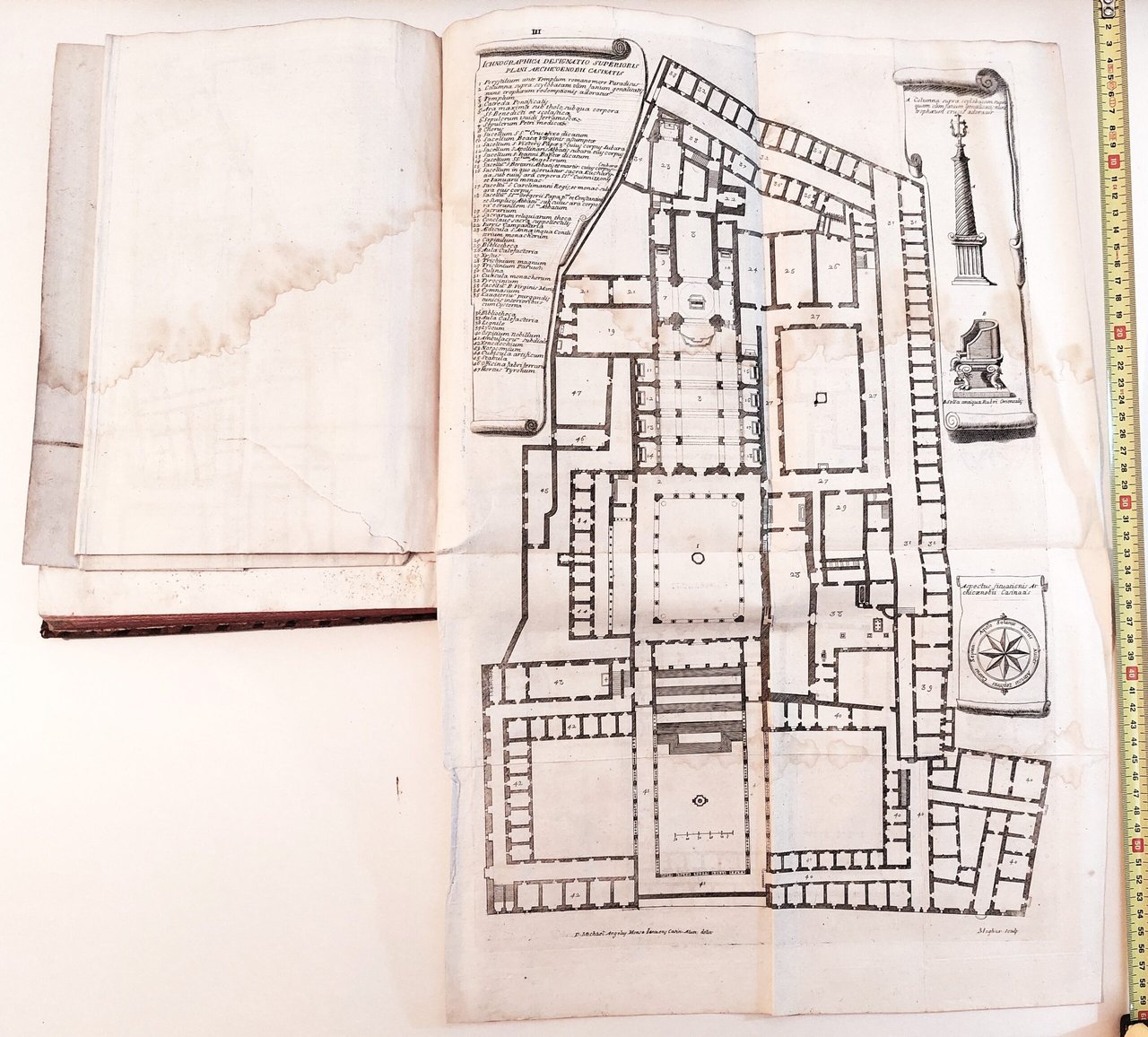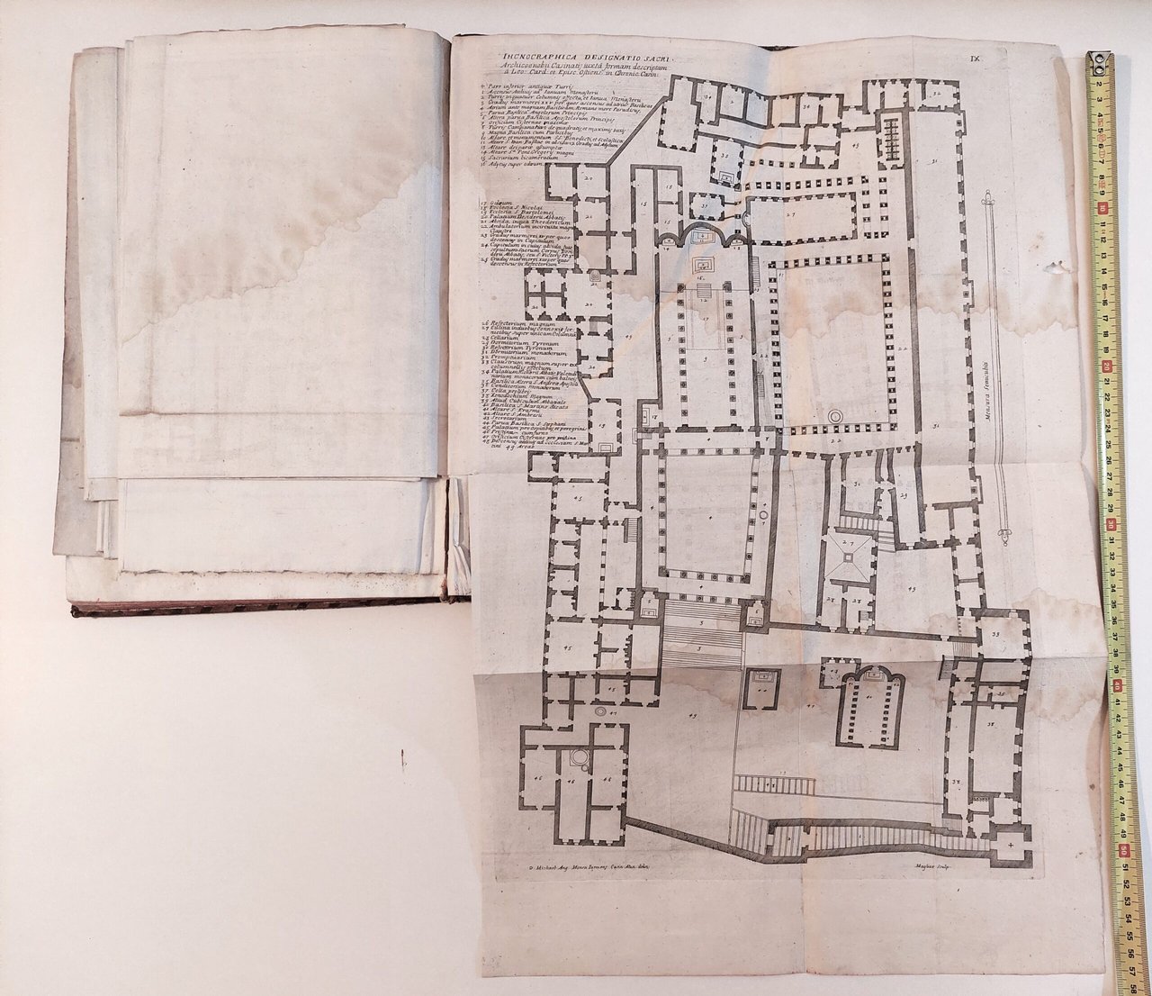 9 Ichnograhia designatio Sacri cm. 58 x 38. Leggero alone di umidità più marcato, su gran parte della tavola. Uno strappo al margine esterno, con mancanza di cm. 2. Alcune pieghe