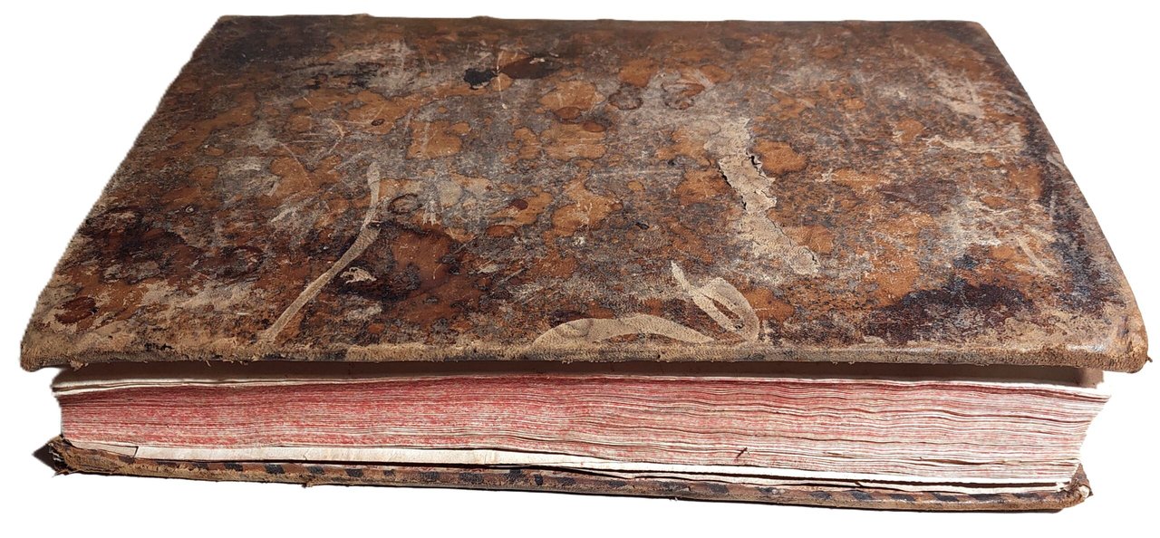 La legatura è in precarie condizioni con numerose macchie e mancanze, cerniera a vista al frontespizio.