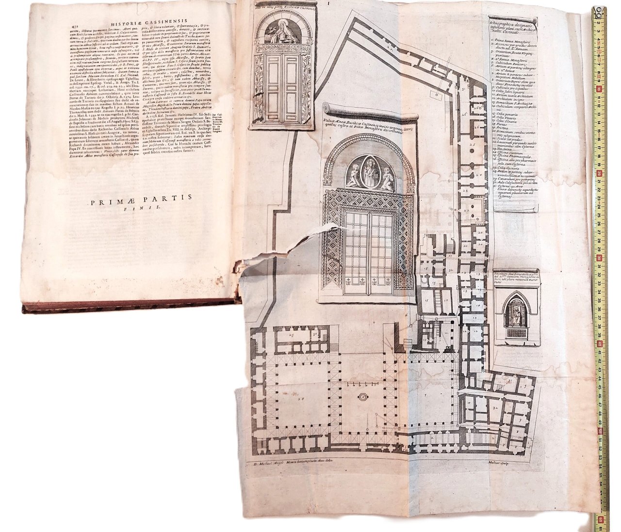 1 Iconographica designatio interioris plani sacri archi coenobii Casinatis cm. 59 x 39, leggero alone di umidità su gran parte della tavola, uno strappo al margine interno di cm. 17 che interessa la parte incisa. Alcune pieghe
