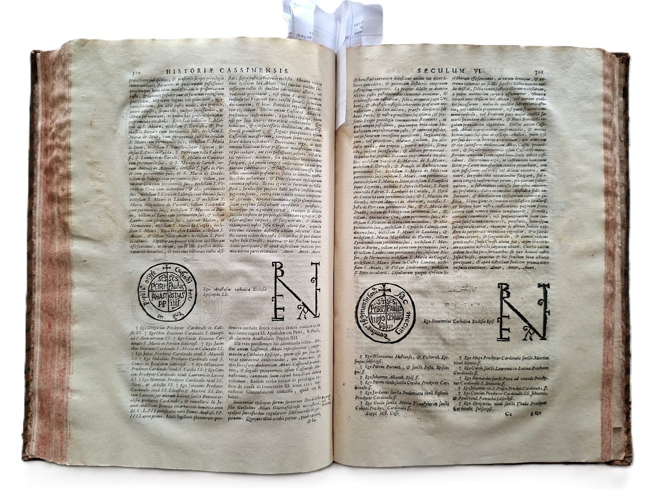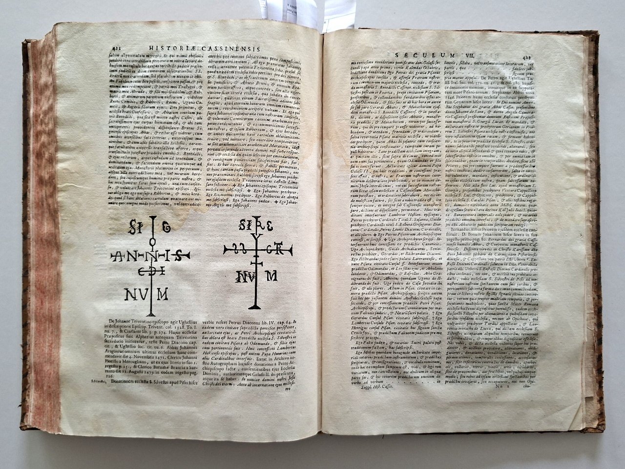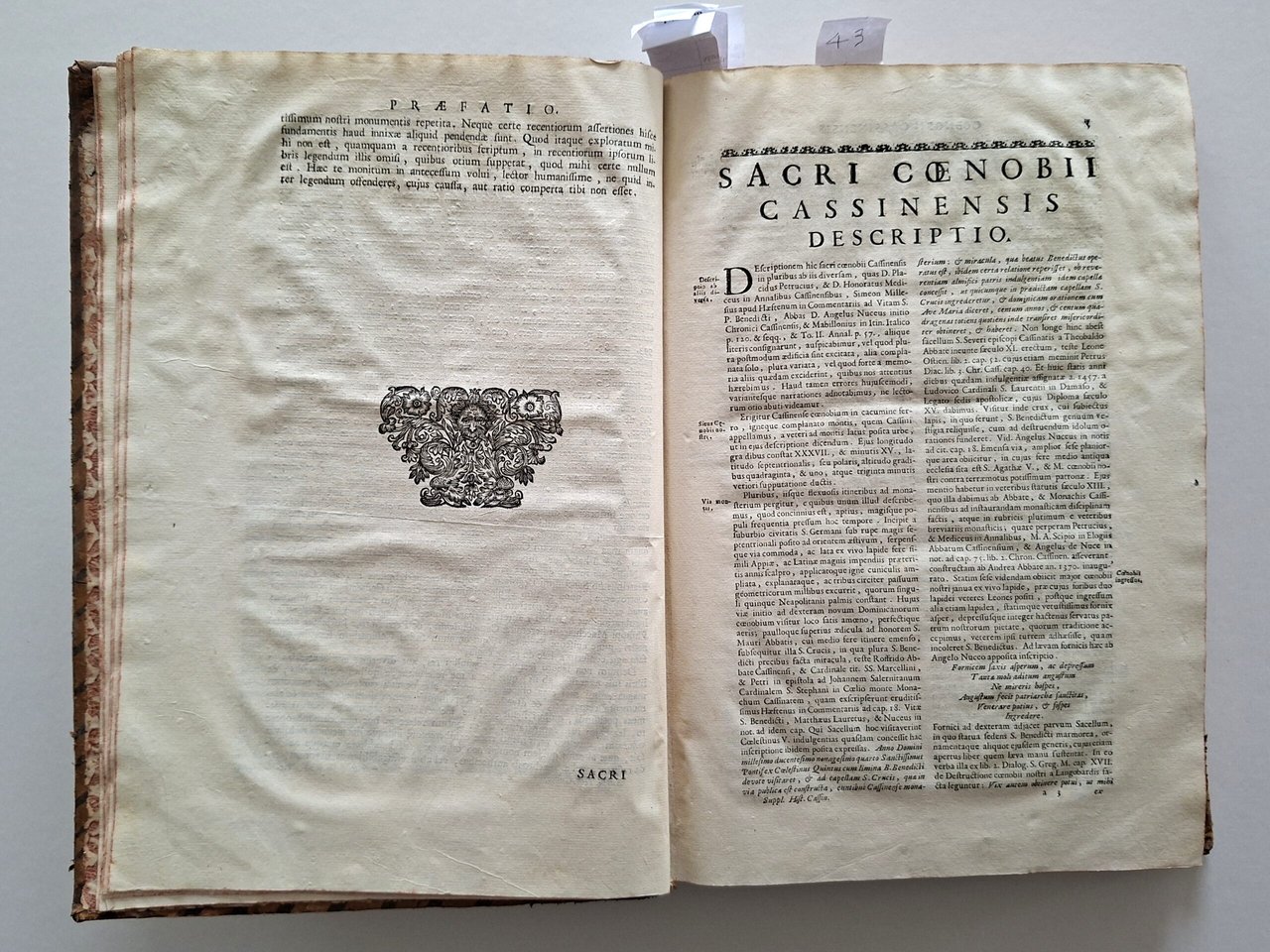 Montecassino. - Gattola (Gattula), E. Historia abbatiae Cassinensis per saeculorum seriem distributa. 2 parti in 1 volume. Venezia, S. Coleti, 1733. Fol. (35 x 26 cm). Con 10 tavole in rame, nonché numerose xilografie nel testo 11 carte non numerate + pp. V-XX, + 432 pagine.
