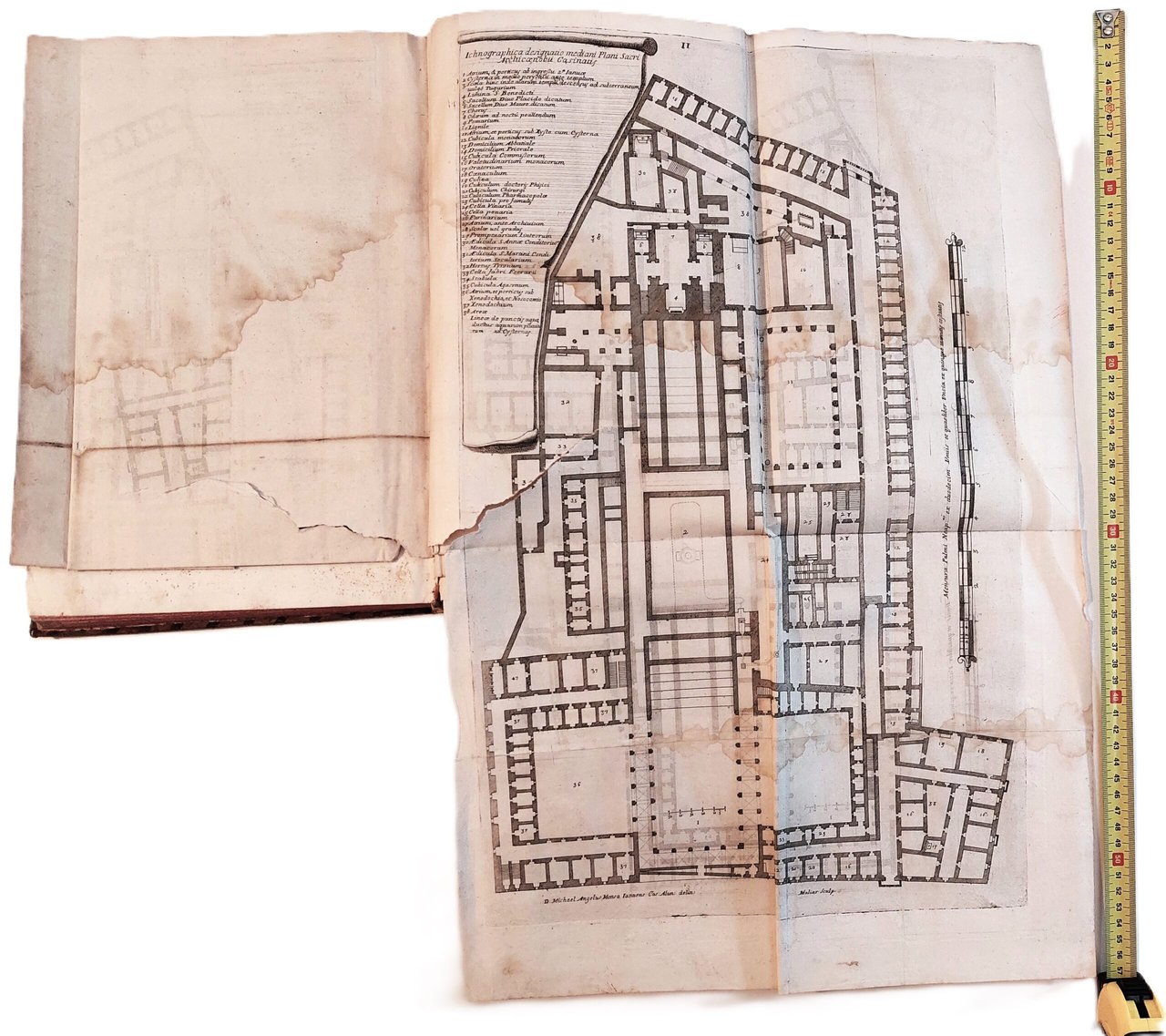 2 Iconographica designatio mediani Plani sacri archi coenobii Casinatis cm. 59 x 38 leggero alone di umidità su gran parte della tavola, uno strappo al margine interno di cm. 14. Alcune pieghe