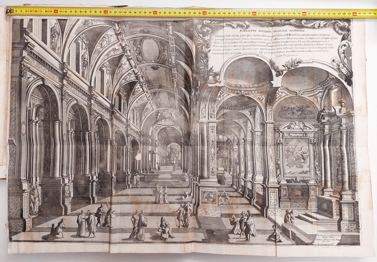 4 Aspectus interior basilicae Casinensis, cm. 49 x 71 Leggero alone di umidità su gran parte della tavola, uno strappo al margine interno di cm. 4, una mancanza con perdita della parte incisa nella parte centrale di circa cm. 2 x 2. Alcune pieghe