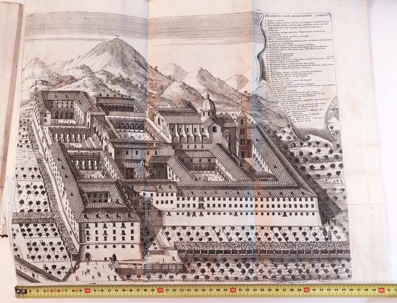5 Prospectus sacri archi coenobii Casinatis cm. 43 x 51. Leggero alone di umidità su gran parte della tavola, uno strappo al margine interno di cm. 2. Alcune pieghe