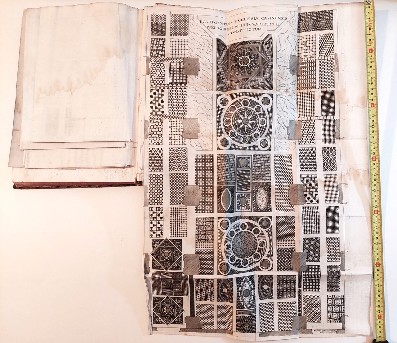 6 Pavimentum Ecclesiae Casinensis divrsorum lapudum variegate constructum cm. 64 x 42. Leggero alone di umidità più marcato, su gran parte della tavola, uno strappo al margine interno di cm. 4. Alcune pieghe