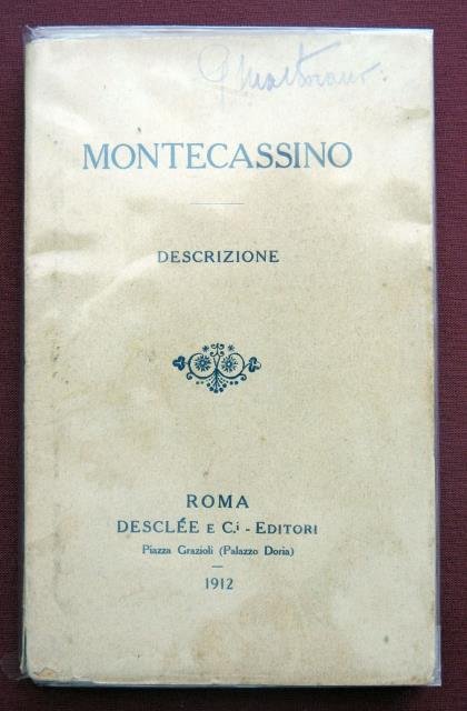 Desclée e C. - Editori, Roma, 1912. In 12esimo, pp. 13 + 1 (Indice), bross. orig. in carta. Dalla nota introduttiva: “ Essendo esaurita l’edizione dell’operetta di P. Paolo Guillaume, “Descrizione storico – artistica di Montecassino”, poiché a volerla ristampare sarebbe stato necessario d’aggiungere più cose venute dopo l’ultima edizione, si è pensato di rifare piuttosto il lavoro da capo” E nel rifonderlo si è creduto, per comodità de’ visitatori, di separare la parte descrittiva dalla storica, in modo da farne due lavoretti possibilmente completi e indipendenti l’uno dall’altro”. Non comune. Dedica coeva datata 1920 alla prima bianca, minimi segni fisioloigici del tempo, lucido trasparente di protezione, stato di conservazione molto buono.