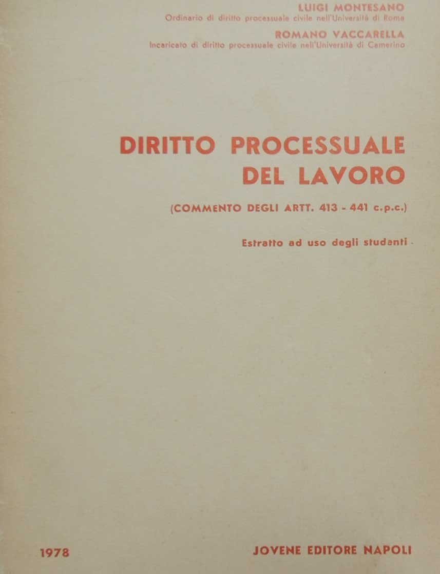 Luigi Montesano, Romano Vaccarella, Diritto processuale del lavoro. (Commento degli artt. 413-441 c.p.c.). Estratto a uso degli studenti, Jovene Editore, Napoli 1978, pp. 146, cm 24, br. ed. Leggere tracce d’uso, minime abrasioni alla brossura, lieve ingiallitura della carta, per il resto ben conservato.