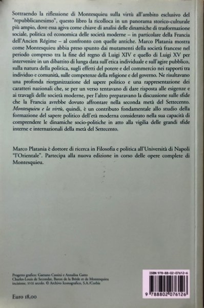 Sottraendo la riflessione di Montesquieu sulla virtù all'ambito esclusivo del "repubblicanesimo", questo libro la ricolloca in un panorama storico-culturale più ampio, dove essa agiva come chiave di analisi delle dinamiche di trasformazione sociale, politica ed economica delle società moderne - in particolare della Francia dell'Ancien Régime - al confronto con quelle antiche. Marco Platania mostra come Montesquieu abbia preso spunto dai mutamenti della società francese nel periodo compreso tra la fine del regno di Luigi XIV e quello di Luigi XV per intervenire in un dibattito di lunga data sull'etica individuale e sull'agire pubblico, sulla natura della politica, sugli effetti del potere e del commercio nei rapporti tra individuo e comunità, sulle competenze della religione e del governo. Ne risultavano una profonda riorganizzazione del sapere politico e una rappresentazione dei caratteri nazionali che, se per un verso tentavano di dare risposta alle esigenze e ai travagli delle società moderne, per l'altro preparavano la discussione sulle sfide che la Francia avrebbe dovuto affrontare nella seconda metà del Settecento. "Montesquieu e la virtù", quindi, è un contributo fondamentale allo studio della formazione del sapere politico dell'età moderna considerato nella sua capacità di comprendere le dinamiche socio-politiche in atto alla vigilia delle grandi sfide interne e internazionali della metà del Settecento.