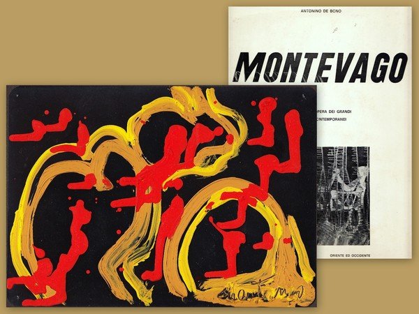 olio originale e firmato di Montevago formato 18X13 cm circa su cartoncino plastificato; catalogo "Montevago, la vita e l'opera dei grandi maestri contemporanei" edito da Bugatti, in 4°, p. similp. con sovracc. ill. (lievi usure alla sovracc.), pp. 32 con riproduzioni b.n. n.t. delle opere dell'artista; copi tra i primi 100 ess. firmati dall'artista a pag. 2; buon es.