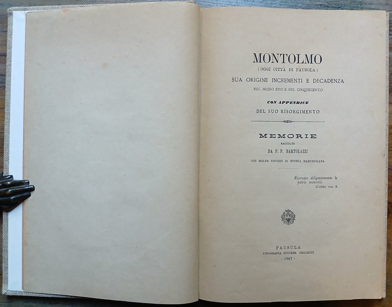 Montolmo (oggi città di Pausola). Sua origine incrementi e decadenza nel Medio Evo e nel Cinquecento. Con appendice del suo risorgimento. Memorie raccolte da P. P. Bartolazzi con molte notizie di storia marchigiana.