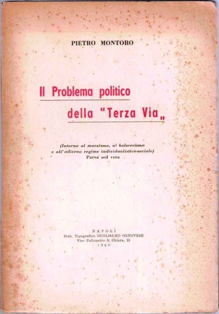 Pietro Montoro, Il Problema politico della Terza Via. Intorno al marxismo, al bolscevismo e all’odierno regime individualistico-sociale, Sta. Tipografico Guglielmo Genovese, Napoli 1948, pp. 93, cm 20, br. ed. Indice: Odierno sbandamento di coscienze – Intorno al marxismo – Intorno al bolscevismo – Sul regime economico individualistico – Su la progredente rinnovazione ed efficienza del regime economico individualistico-sociale. Alla prima carta bianca, dedica manoscritta dall’autore. Una piccolissima mancanza al dorso, leggere fioriture alla brossura, minima brunitura della carta, per il resto perfetto. In gran parte intonso. Non comune.