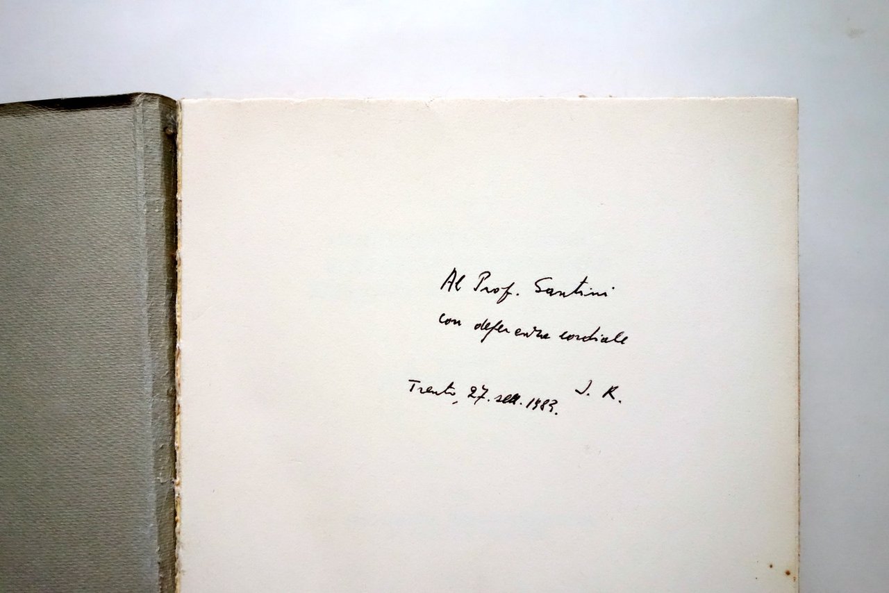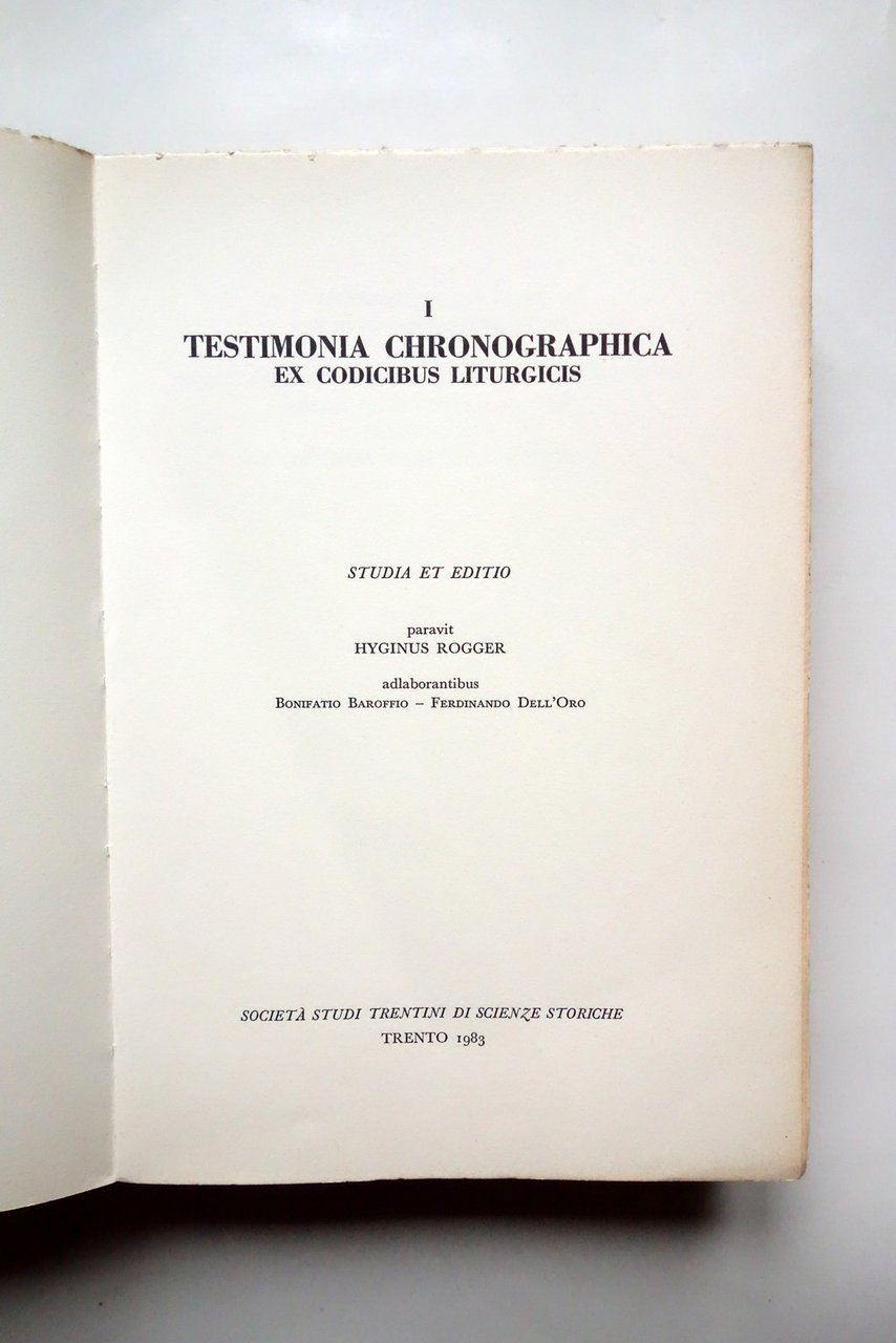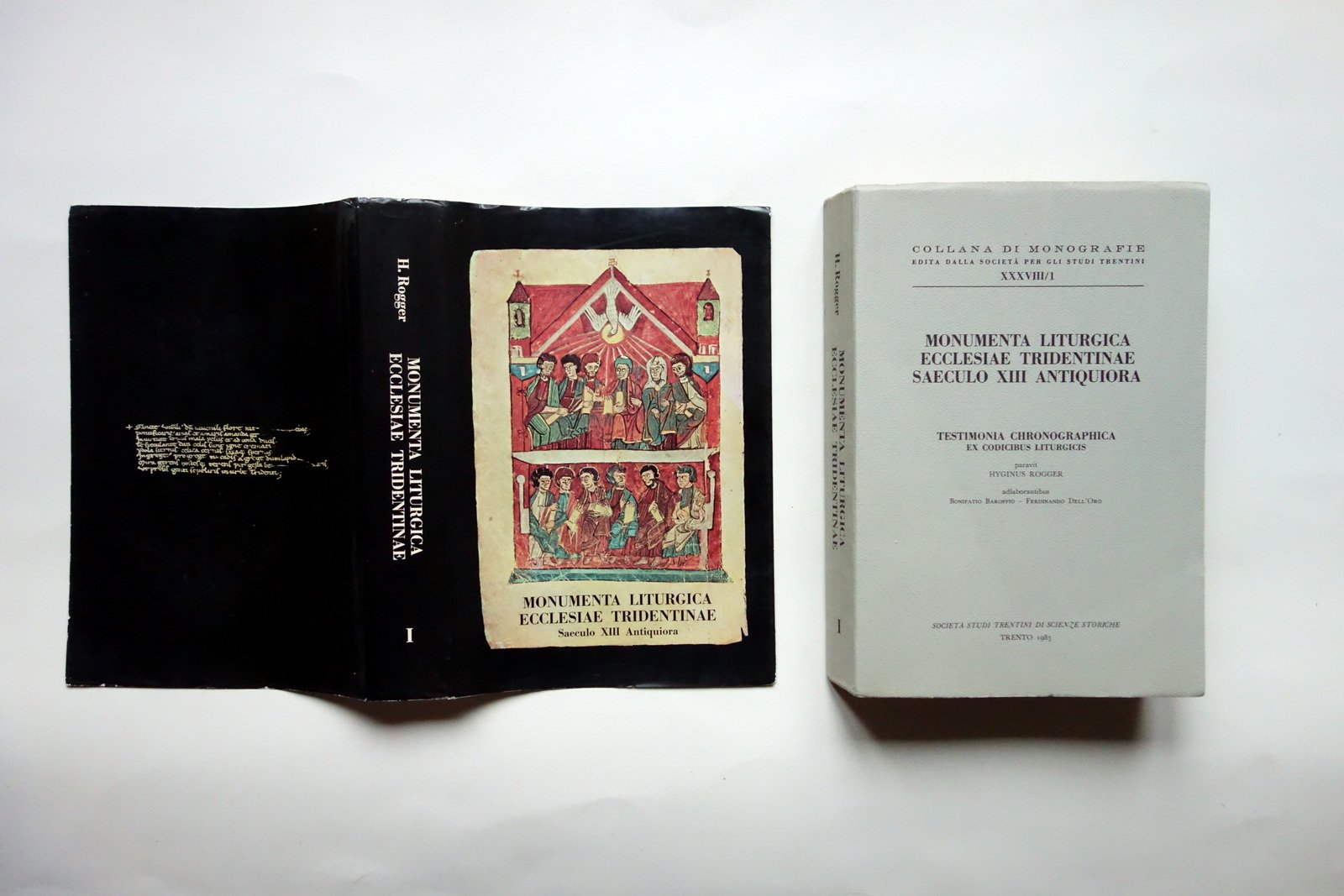 F. dell'Oro - H. Roger (a cura di), Monumenta Liturgica Ecclesiae Tridentinae saeculo XIII antiquora Vol. I - Testimonia Chronographica ex codicibus liturgicis studia et editio paravit Hyginus Rogger adlaborantibus Bonifatio Baoffio - Ferdinando dell'Oro Società Studi Trentini di Scienze Storiche, Trento 1983; cm 25x17; pp. XXIV-378 con ill.; brossura ed. con sovraccoperta ed. Alla prima bianca vecchia dedica a penna ed applicato ex libris del precedente proprietario. Volume I. Condizioni di conservazione Buone condizioni con tracce d'uso, sovraccoperta ed. minimamente sgualcita ai margini. Interni buoni; alcune pagine con leggere sottolineature e/o note a matita (vedi foto). SETT62.L24846 N