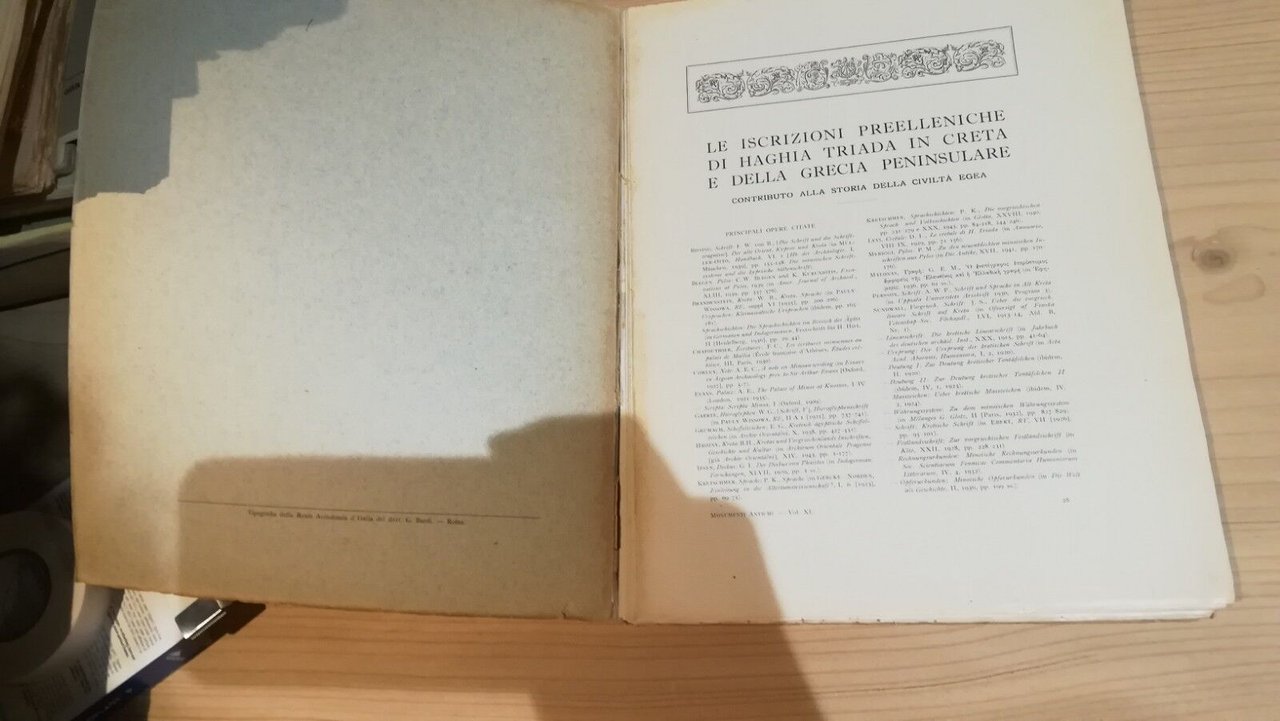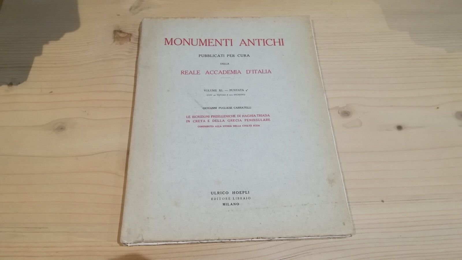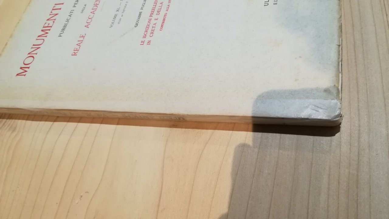 Monumenti antichi pubblicati per cura della Reale Accademia d'Italia volume XL puntata 4 - Le iscrizioni preelleniche di Haghia Triada in Creta e della Grecia peninsulare Hoepli Prima edizione 1945 da pagina 422 a 610, con 40 tavole e 253 incisioni. Libro in buone condizioni, piccola riparazione con nastro legatoriale su dorso, legatura comunque piuttosto delicata con alcuni fascicoli che tendono a staccarsi, minime fioriture, piccole abrasioni ai margini. Non esitate a contattarci per altre foto o richieste. Saremo lieti di soddisfare ogni vostra esigenza.