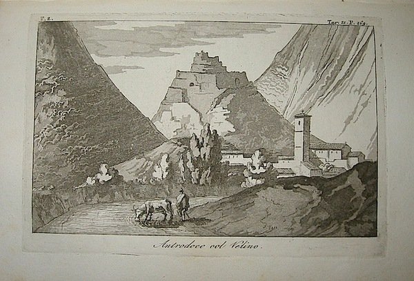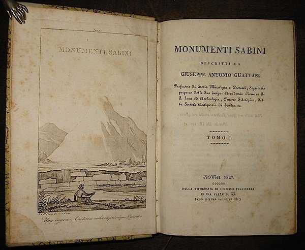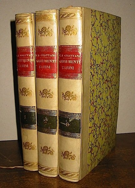 8vo (cm. 21,4), 3 Voll., VIII-295(1) pp. con 11 tavv. f.t.; 367(1) pp. con 31 tavv. f.t.; 395(1) pp. con 17 tavv. f.t. Ottime legature coeve in mz. pergamena con ricchi fregi e titoli in oro su doppio tassello al dorso. Tagli colorati a spruzzo. Freschissimo esemplare, completo delle incisioni di L. Prosseda. Opera rara, talora accompagnata da una grande carta topografica, qui non presente. Ex libris R. Micacchi. Collazione conforme a Lozzi, n. 1655.
