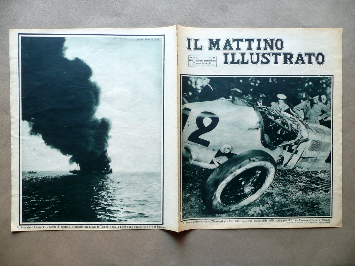 Settimanale, Il pilota polacco Conte Zborowsky schiacciato dalla sua automobile nella corsa per il Gran Premio d'Italia a Monza" in "Il Mattino Illustrato" Anno I - Numero 38 Napoli, 27 Ottobre - 3 Novembre 1924 Napoli 1924; cm 35x29,5, pp. 16 con numerosissime ill. per la maggior parte fotogr. in b/n e virate a vari col., sia nel t. che fuori t.; numero completo. Condizioni di conservazione Esemplare in buone condizioni con tracce d'uso; dorso con alcune piccole tracce di precedente inserimento dell'esemplare entro volume; margini lievemente rifilati. Copertina dedicata all'incidente automobilistico che ha coinvolto il pilota polacco Zborowsky durante il GP di Monza del 1924. Numero completo. SC03.D11330 N F "