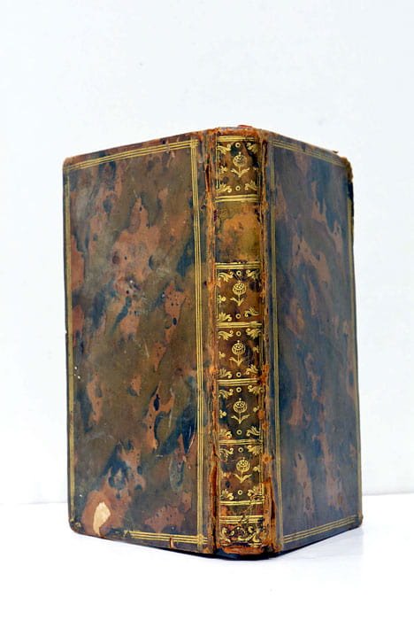 LIV. Page 3 - page 84. 2 feuillets. 1 feuillet blanc. (13x8 Cm). Plein veau marbré. Dos lisse orné. Triple-filets sur les plats. Tranches dorées. Coins et coiffes émoussés. Charnières fendues. Les deux premières pages manquantes. Intèrieur de l'ouvrage en bon état.