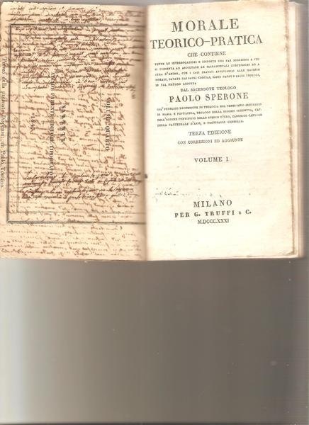 Volume I (II, III e IV).<BR>3°ediz. con correzioni ed aggiunte.<BR>4 voll. rilegati in 2, in 16°, pp. 252; 309 (2); 322 (2); 335 (1). Legature antiche in mz. pergamena con tit. manoscritto al dorso. Lievi abrasioni ai piatti. Antiche note manoscritte alle sguardie.<BR>Paolo Sperone fu "Pubblico Professore di Teologia nel Venerando Seminario di Massa e Populonia, Teologo della Diocesi suddetta, Cav. dell'Ordine Pontificio dello Speron d'Oro, Canonico Cantore della Cattedrale d'Asti, e Provicario Generale".