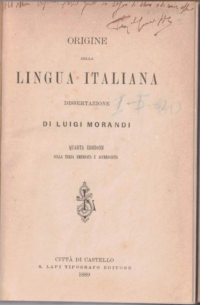 Origine della lingua italiana. Dissertazione di Luigi Morandi, S. Lapi Tipografo Editore, Città di Castello 1889, quarta ed. sulla terza emendata e accresciuta, pp. 85 (8), cm 18, legatura in mezza tela nera con titoli manoscritti al dorso. Firma d’appartenenza e segnatura di collocazione al frontespizio. Qualche sporadico segnetto ai margini, minime fioriture, leggera brunitura della carta, per il resto ben conservato.