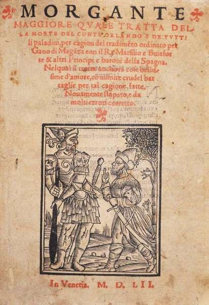 MORGANTE MAGGIORE. - Quale tratta della morte del conte Orlando e de tutti li paladini, per cagion del tradimento ordinato per Gano di Maganza con il re Marsilio e Buiaforte & altri principi e baroni della Spagna. Nel qual si tratta anchora cose bellissime d'amore, con infinite crudel battaglie per tal cagione fatte. Novamente stampato, e da molti errori corretto.