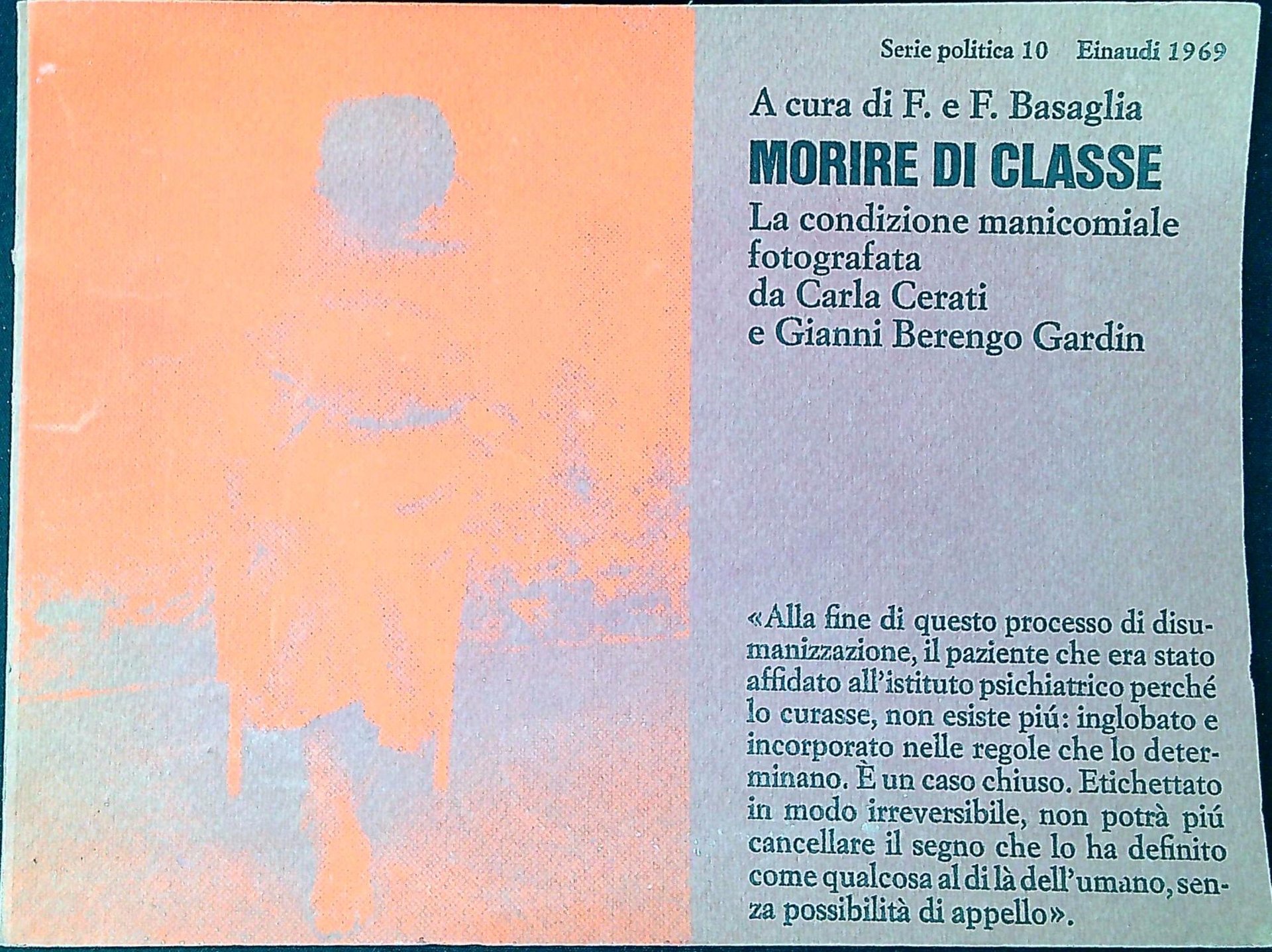 fotografata da Carla Cerati e Gianni Berengo Gardin ; a cura di Franco Basaglia e Franca Basaglia Ongaro Morire di classe : la condizione manicomiale. Torino, G. Einaudi 1969, 88 p. : ill. ; 18x24 cm Firma d'appartenenza alla prima bianca (57042)