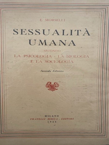 <p>MORSELLI E. SESSUALITA' UMANA SECONDA LA PSICOLOGIA, LA BIOLOGIA E LA SOCIOLOGIA. A BOCCA, 1944 CODICE 963</p>, , <p> </p>, , <p>SCATOLA 15</p>,