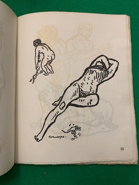 In 4°; (4), VIII, (6) cc. Conservato all'interno il raro libretto pubblicitario di VIII pp. delle opere di Rouveyre. Brossura editoriale, con sopraccoperta editoriale con titolo in bei caratteri Liberty al piatto anteriore. Prima edizione in ottime condizione di conservazione e ancora a fogli chiusi. Tiratura di 1000 esemplari, il nostro è il numero 552. Celebre opera del noto caricaturista francese dedicato al corpo femminile. André Rouveyre (29 marzo 1879-18 dicembre 1962) è stato uno scrittore, caricaturista e grafico francese dell'inizio del XX secolo. Membro di diversi circoli dell'élite culturale del suo tempo, è forse ricordato ugualmente come soggetto di disegni di importanti artisti europei quali Henri Matisse e Amedeo Modigliani. Avendo incontrato Matisse nell'atelier di Gustave Moreau nel 1896, i due iniziarono un'amicizia che avrebbero poi mantenuto per tutta la vita. I disegni di Rouveyre mostrano una miscela del primo minimalismo (che ricorda Matisse) con l'espressionismo. La natura caricaturale del suo lavoro è opportunamente descritta da Aldous Huxley nel romanzo Crome Yellow, quando un personaggio incontra il proprio ritratto poco lusinghiero: "Un Rouveyre muto e inglorioso è apparso in ognuna di quelle linee crudelmente chiare". Rouveyre morì nel dicembre 1962 a Barbizon, in Francia. Prima edizione in buone-ottime condizioni di conservazione. First-edition, a very good copy.