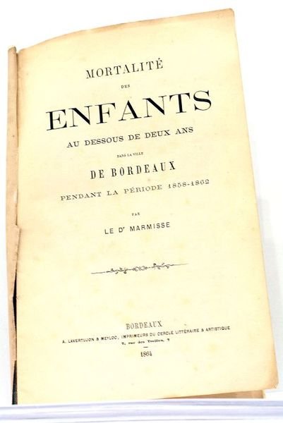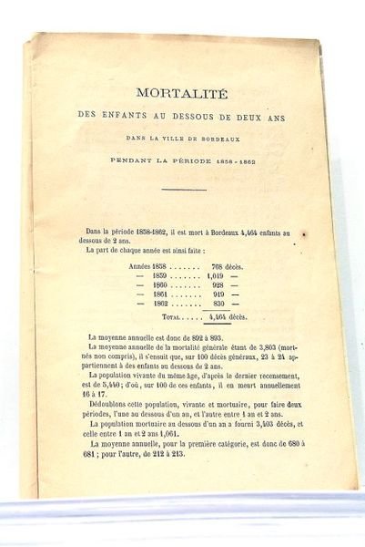 2 pages non chiffrées + 10 pages (15x22cm). Couverture imprimée protégée par du papier cristal. Rousseurs à la couverture. Papier bruni. Bordeaux. Aquitaine. Enfants. Démographie.