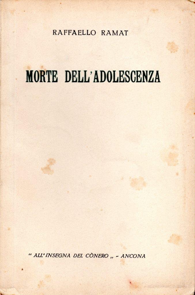 Morte dell'adolescenza, prima edizione 1935, pp. 90, formato 13 x 19,5.<BR>Copertina morbida di color crema con titoli in nero e verde al piatto anteriore.All'interno presente dedica dell'autore all'editore Enrico Vallecchi, datata 1935.<BR>Copertina con minime fioriture.Nel complesso condizioni molto buone.