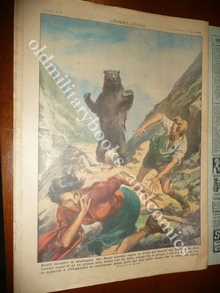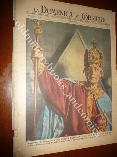 DESCRIZIONE: LA DOMENICA DEL CORRIERE 2 agosto 1953 n. 31 In copertina: Morte di Ruggero Ruggeri a 82 anni. Al retro: Sui Monti Lessini, sopra la Valle dei Ronchi nel Trentino incontro con un orso bruno. CONDIZIONI DELL'OGGETTO: Discrete/Buone, con sovracc. azzurrina, con piccole pieghe. PESO/WEIGHT: 88 g without package