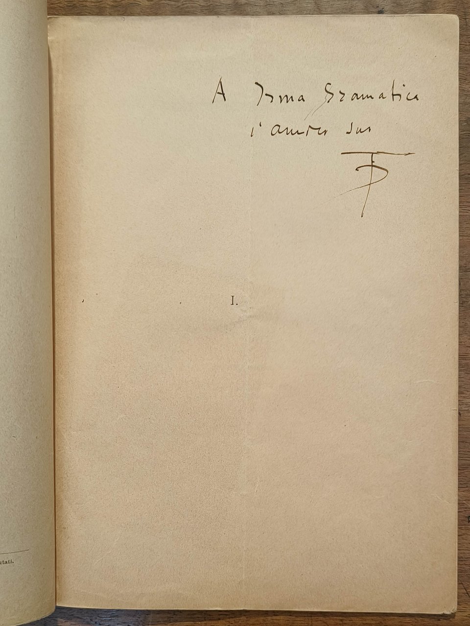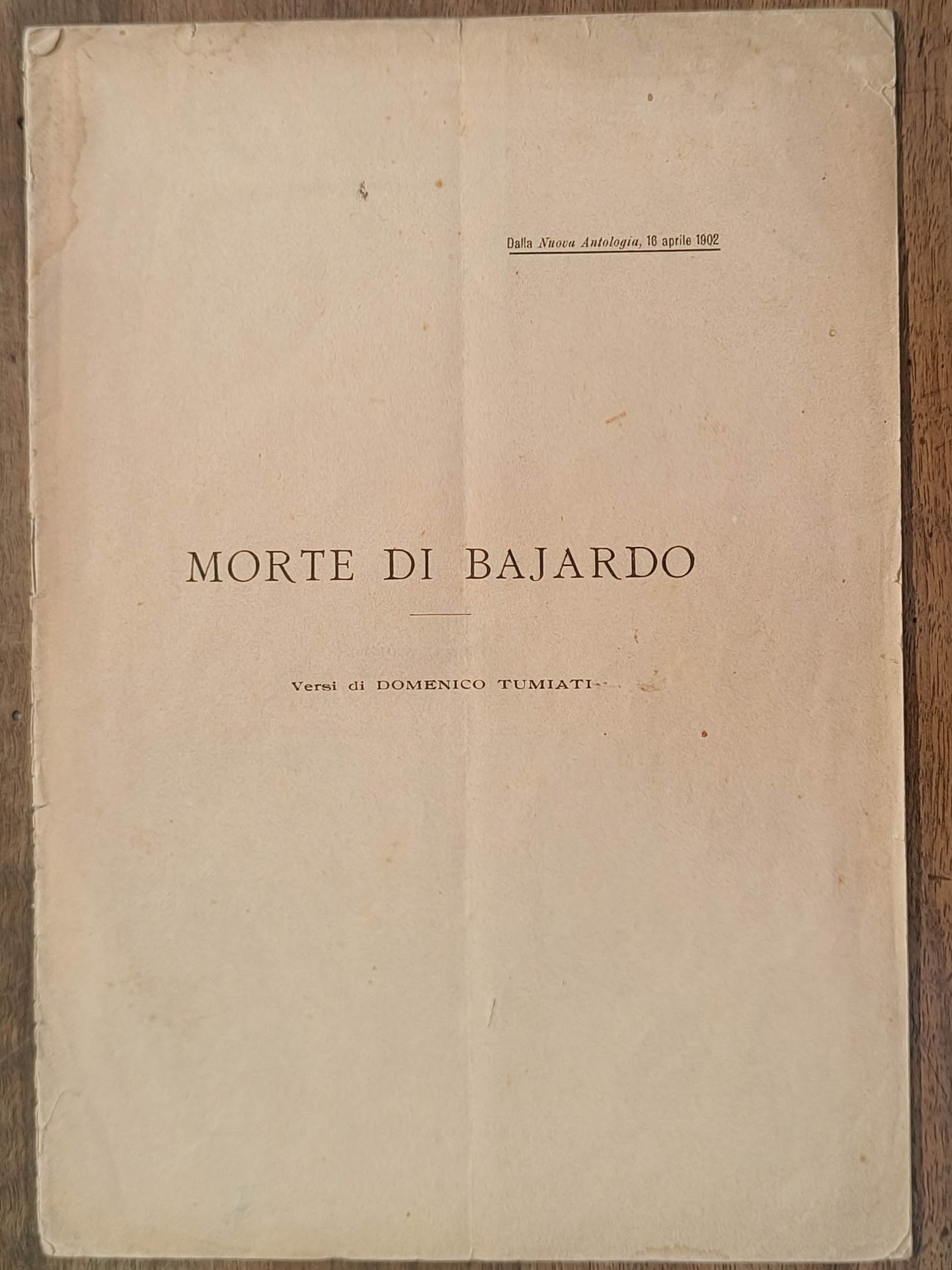 Morte di Bajardo, Roma, 1902. Cm 26,5. Pp. 19. Brossura a filo. Piega verticale, piccola gora d'acqua. Dedica autografa dell'autore "A Irma Gramatica l'amor suo D.T." .