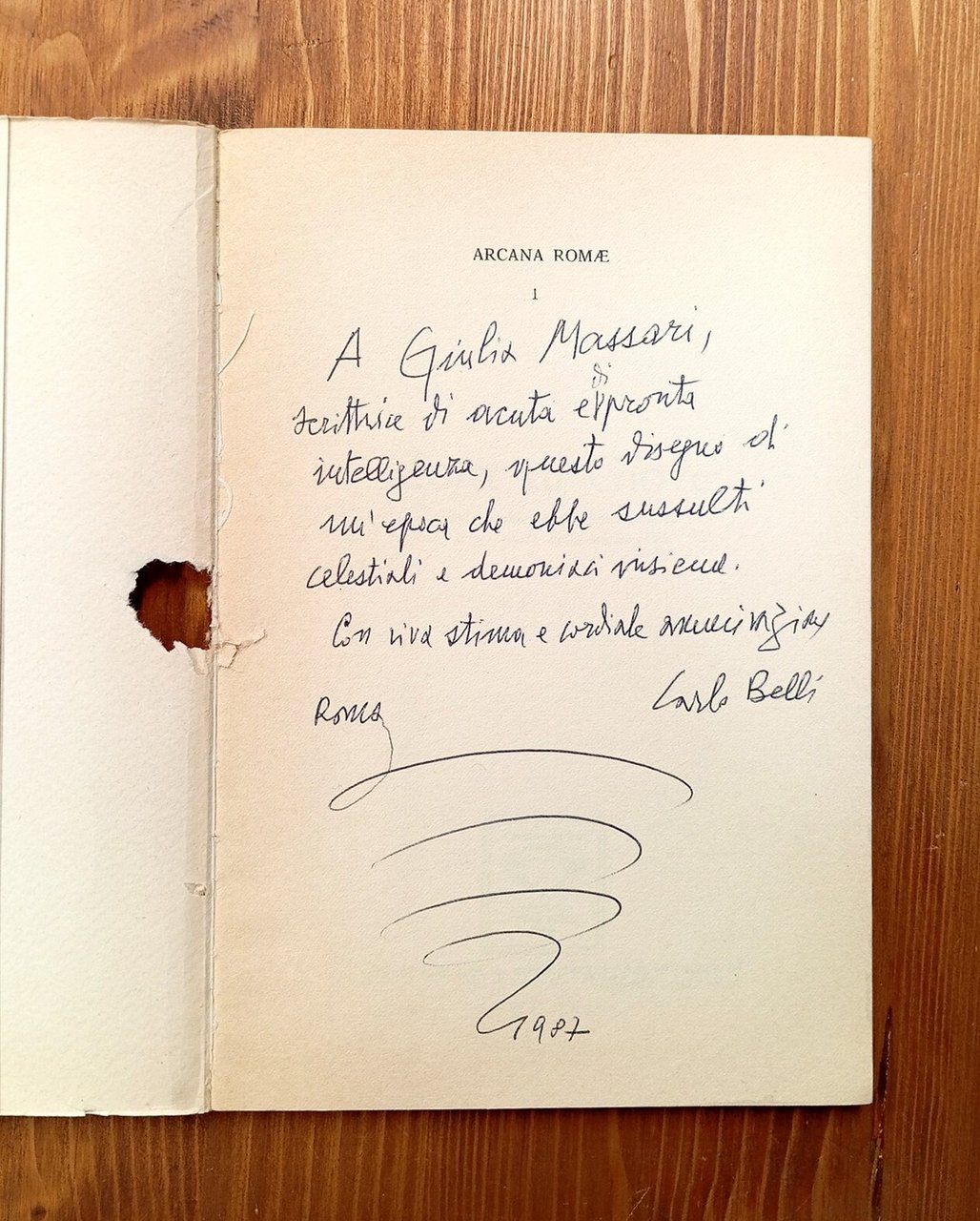 Collana "Arcana Romae", 1. In apertura, lunga dedica autografa dell'Autore a Giulia Massari (1924-2015), giornalista vicina al milieu politico e culturale romano dagli anni sessanta in poi - Brossura editoriale con bandelle, 71 pagine con alcune tavole intercalate. Vistosa tarlatura al margine sinistro del piatto e al dorso, interno ottimo.
