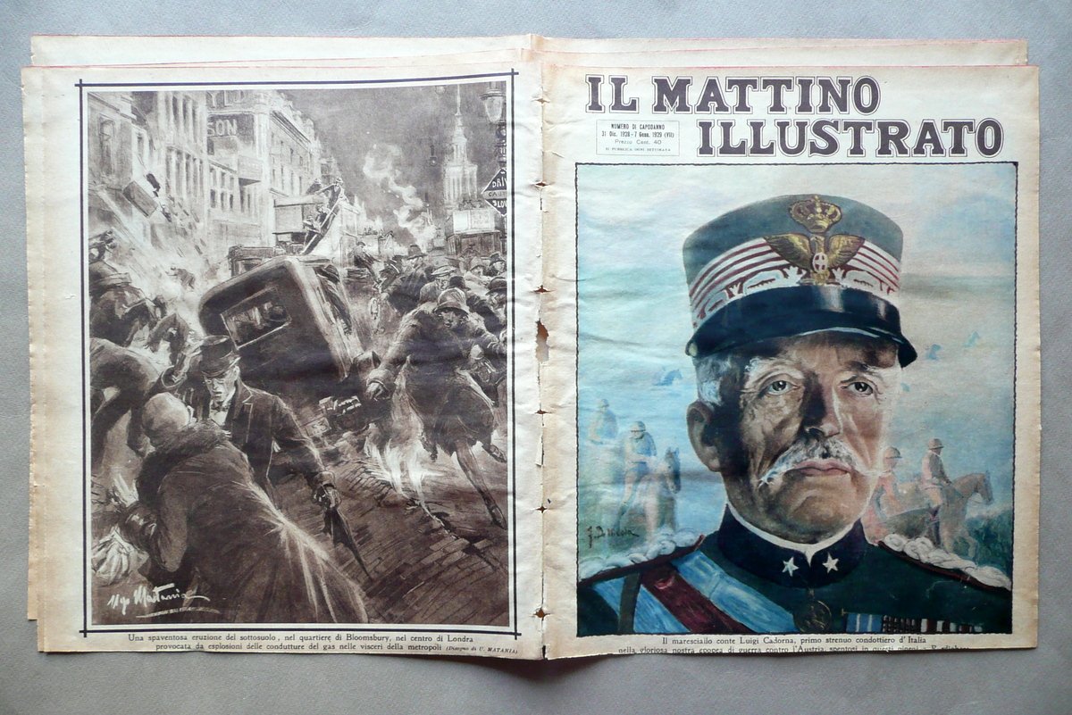 Settimanale, Il Maresciallo conte Luigi Cadorna, primo strenuo condottiero d'Italia nella gloriosa epopea di guerra contro l'Austria, spentosi in questi giorni a Bordighera" in "Il Mattino Illustrato" Numero di capodanno Napoli, 31 Dicembre - 7 Gennaio 1929 Napoli 1929; cm 35x29,5, da pagina 865 a pagina 880 (esemplare autonomo con numerazione progressiva), con numerosissime ill. per la maggior parte fotogr. seppiate, virate al verde e a col. sia nel t. che fuori t.; esemplare a fogli sciolti. Numero completo. Condizioni di conservazione Esemplare in buone condizioni con tracce d'uso; dorso con poche piccole mancanze e strappetti, alcuni forellini e tracce di precedente inserimento dell'esemplare entro volume. Copertina a colori dedicata alla scomparsa del Maresciallo Cadorna. Nel paginone centrale, tra le altre, sono riportate tre illustrazioni fotografiche seppiate relative a tale evento (vedi foto). Numero completo. SC03.D11339 N F "