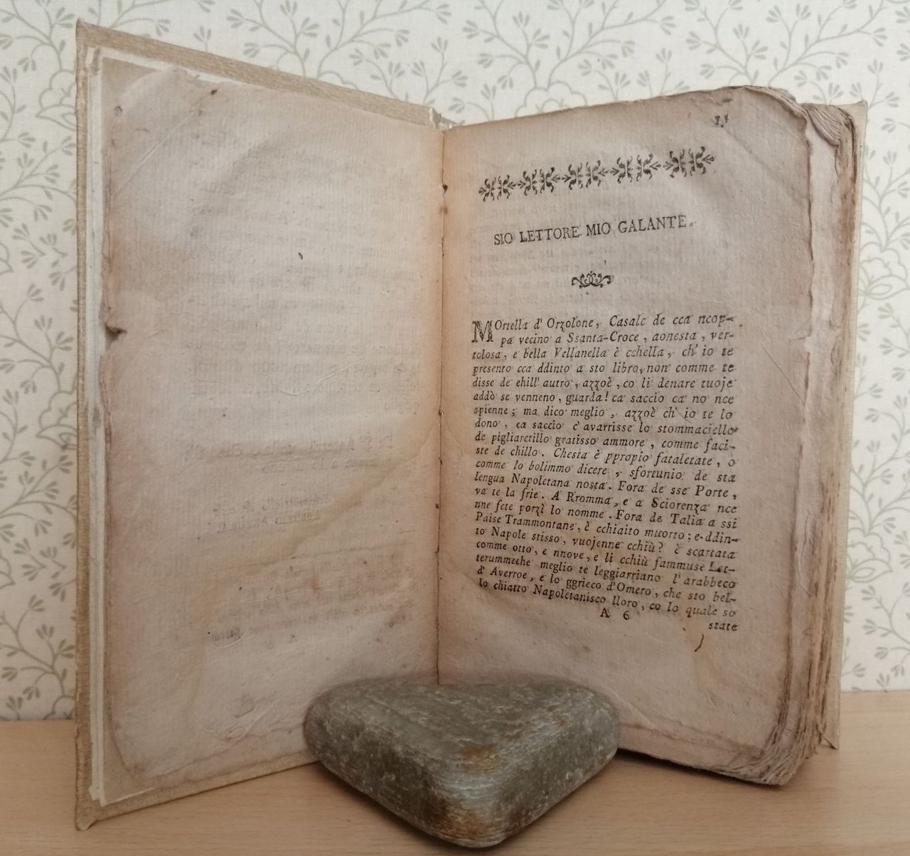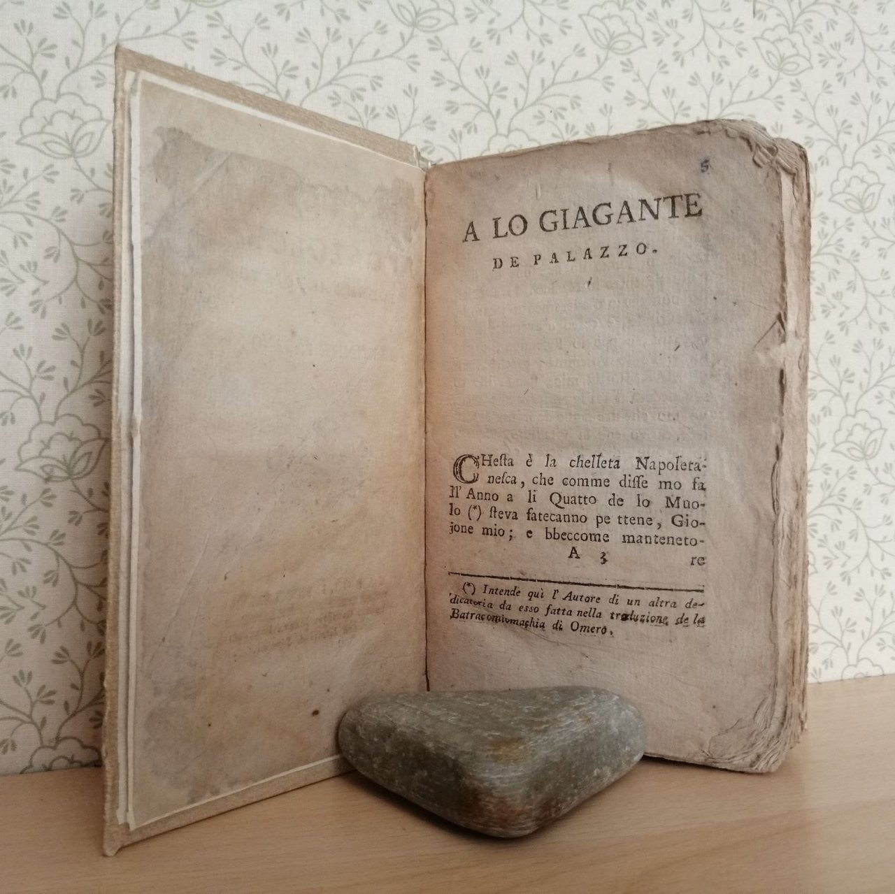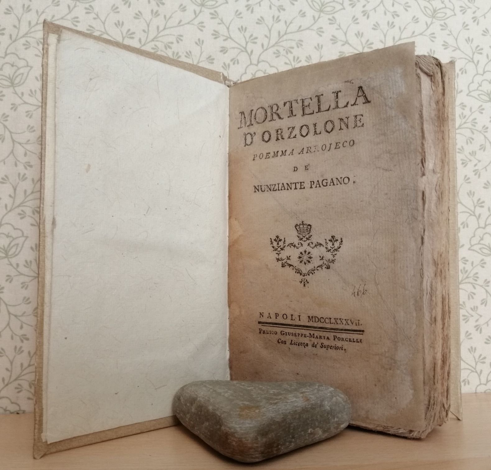 Volume in 8 cartonato alla rustica, sguardie, frontespizio, 322 di 323 pp. Un callido, piacevolissimo divertissement tipico dell'epoca in cui i letterati riuniti in accademie si sfidavano a crear versi. Particolari e sempre scarsamente reperibili le raccolte in dialetto che, per loro stessa sostanza, erano relegate in ambiente alquanto ristretto e normalmente stampate in numero limitato di copie. Questa presentata, anche se non perfetta, copia gradevolissima. La carta non ottima alquanto fiorita in alcuni quaderni ma la qualit del contenuto e la rarit fan aggio ai difetti. Oltre ai due componimenti di Pagano, il volume contiene sonetti dialettali degli Accademici del Portico della Stadera, Andrea Gaucci, Serafino Ciroffi, G. M. Fagone, F. M. Pisarani, V. Pitera', G. Giannini, e in particolare la Canzone a llaude de lo Melone d'acqua di Sirverio Giuseppe Cestari. Impagabile