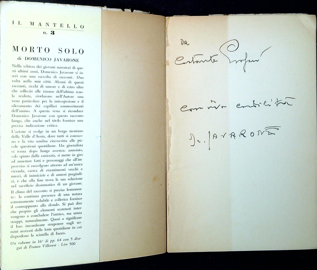 Javarone, Domenico Morto solo : racconto. Milano ; Roma, Bocca 1954, 59 p., [5] carte di tav. : ill. ; 21 cm. Autografo dell'autore (72133)