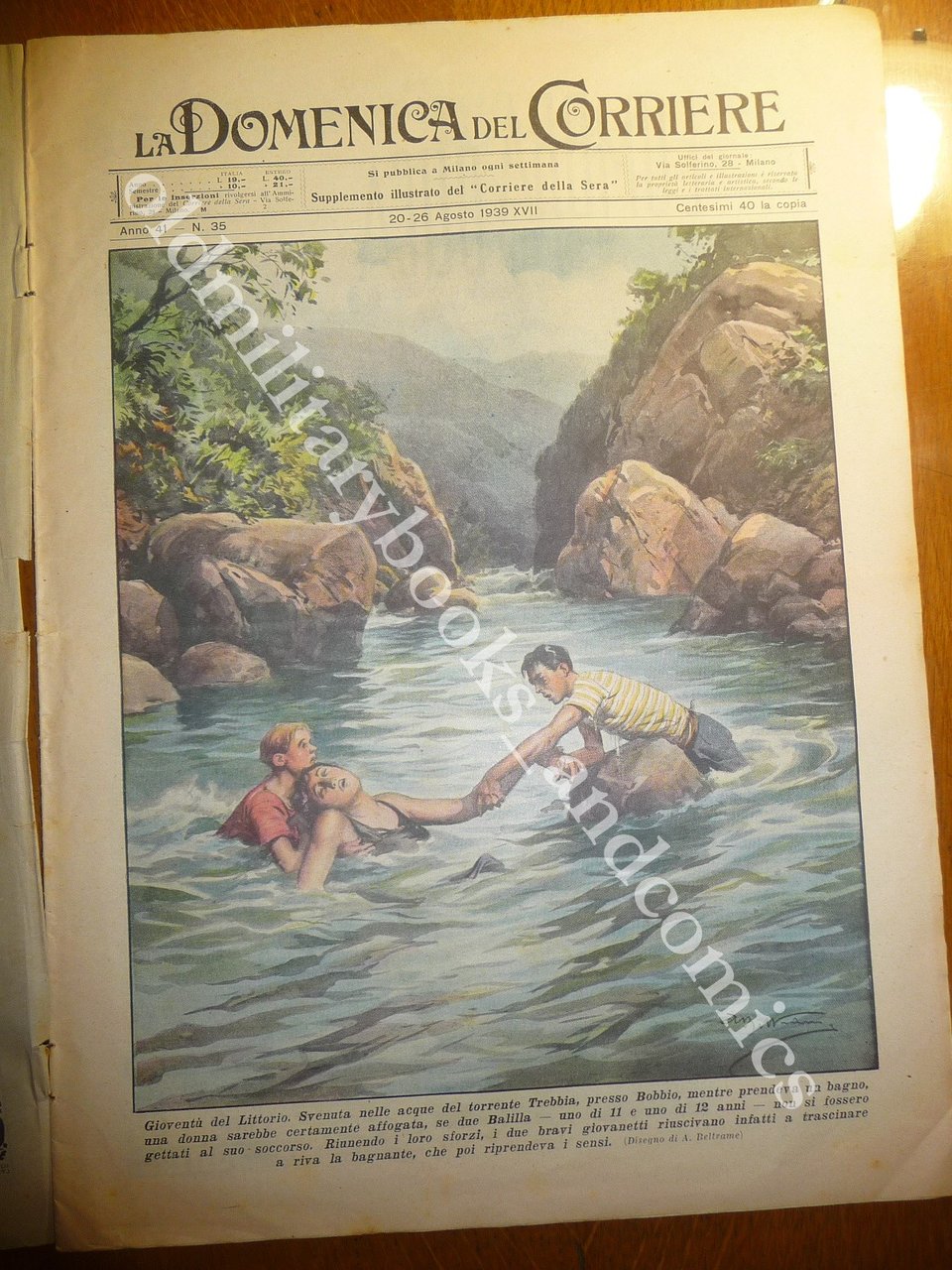 COPERTINA: Gioventù del Littorio. Svenuta nelle acque del torrente Trebbia, presso Bobbio, mentre prendeva un bagno, una donna sarebbe certamente affogata, se due Balilla – uno di 11 e uno di 12 anni – non si fossero gettati al suo soccorso. Riunendo i loro sforzi, i due bravi giovanetti riuscivano infatti a trascinare a riva la bagnante, che poi riprendeva i sensi.