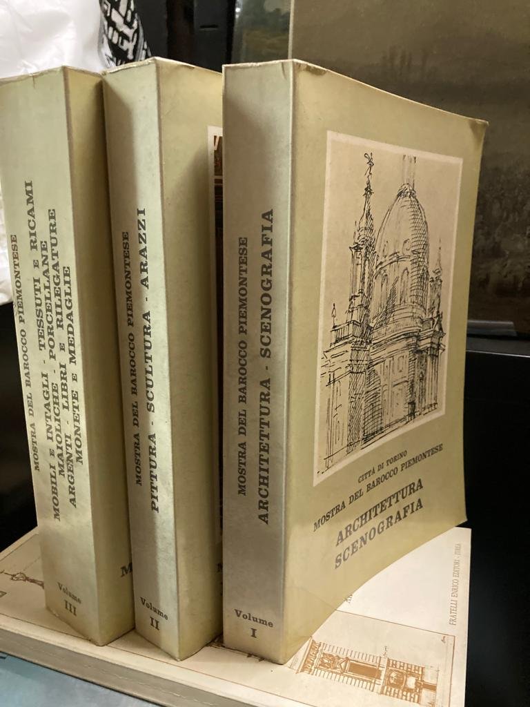 3 volumi in-8° (240x170mm), pp. XIX, 191; 215; 181; brossure originali figurate a colori. 338 tavv. al primo vol. (8 a colori), 360 al secondo (17 a colori), 682 al terzo (32 a colori). Ottimo stato. Prima edizione. Amplissimo catalogo dell'importante mostra del barocco piemontese tenutasi a Torino fra il giugno e il novembre del 1963, sotto l'ato patrocinio del Presidente della Repubblica Segni. Il primo vol., dedicato all'architettura e alla scenografia, contiene studi di Vittorio Viale, Marziano Bernardi, Nino Carboneri, Viale Ferrero; il secondo, vertente sulla pittura, la scultura e gli arazzi, raccoglie contributi di Andreina Griseri, Luigi Mallé, M. Viale Ferrero; l'ultimo, con studi di Vittorio Viale, M. Viale Ferrero, Augusto Bargoni, Marina Bersano Begey, Anna Serena Fava, Giovanna Grandi, Rosalba Amerio Tardito, è dedicato quasi interamente alle arti applicate e ad aspetti sino ad allora ritenuti minori del barocco e della civiltà artistica in genere (mobili, intagli, tessuti, ricami, maioliche, porcellane, argenti, libri, legature, monete, medaglie, la casa di caccia di Stupinigi, i restauri a Palazzo Reale).