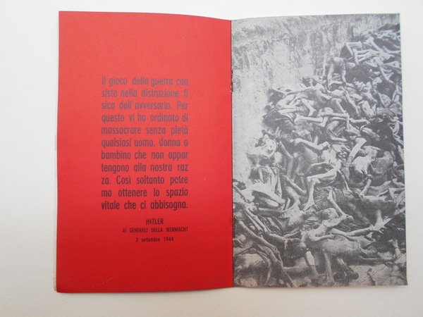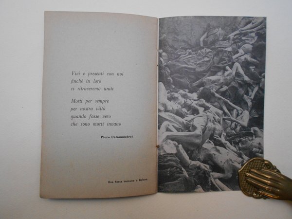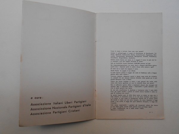A cura dell'Associazione Italiani Liberi Partigiani, Associazione Nazionale Partigiani d'Italia, Associazione Partigiani Cristiani.<BR>Catalogo della mostra di Parma 5 -11 febbraio 1960.<BR>In 8°; pp. 20 n. n. di fotografie in nero dei campi di concentramento alternate a testi letterari; brossura editoriale; spillato.<BR>CONDIZIONI OTTIME. Raro.