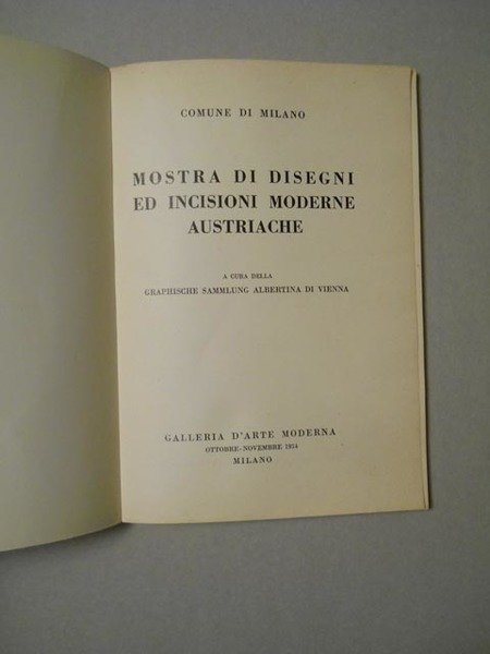Catalogo della mostra organizzata dal Comune di Milano e curata dalla Graphische Sammlung Albertina di Vienna, tenutasi alla Galleria d'Arte Moderna di Milano, da ott. a nov. 1954. Il volume si apre con una presentazione di Benesch O. e con un testo introduttivo di Hoffmann.; segue poi una sezione con brevi biografie degli autori dei disegni esposti ed infine vengono le tavole. Vi sono opere di importanti artisti: Klimt, Schiele, Peche, Kolig, Wiegele, Faistauer, Kubin, Andri, Kokoschka, ecc…
