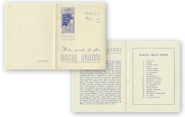 Note: In 16°, invito di 4 facciate per la mostra di Raoul Viviani tenutasi alla Galleria Alessandro Gazzo a Bergamo dall'11 al 25 maggio 1941; buon es.