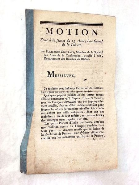 4 pages. (21x13 Cm). Broché, renforcé au dos. Petites salissures et légères traces de plis. Rare impression d'Aix. Brochure sur la persécution des Français installés en Italie en représailles à la révolution. L'auteur, Membre de la Société de la Constitution établie à Aix, demande à l'Assemblée des mesures pour assurer la protection de ces civils.