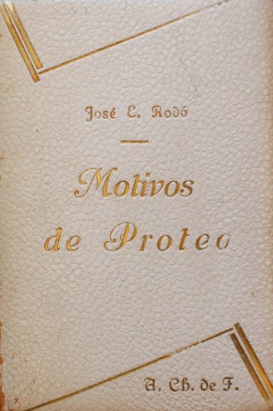 Montevideo,1909.In 16¡,432 pp.pi indice.Legatura in similpelle bianca,con titoli,in oro,al piatto anteriore ed al dorso.Frontespizio decorato a motivi floreali,slegato dal corpo del libro,l'interno,invece,sebbene ingiallito, in ottimo stato.Il titolo riprende il mito di Proteo che poteva assumere forme diverse e che, considerato il depositario della conoscenza presente e passata.A tal proposito,l'Autore,vuole che il libro sia considerato in un continuo divenire,un libro aperto ad una prospettiva infinita.Testo in Spagnolo.