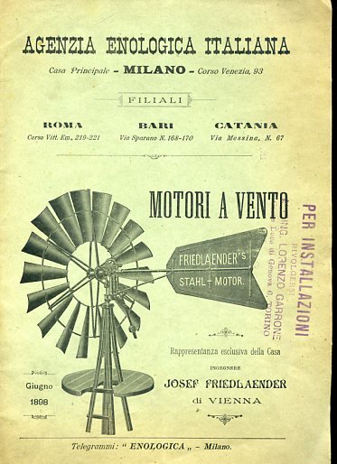 In-8°, pp. 24, brossura editoriale verdina con illustrazione al piatto e timbro di possesso del tempo (altri timbri privati all'interno). Una xilografia al piatto posteriore, interamente illustrato con incisioni xilografiche n.t. Tabelle. Una traccia di piegatura. Ottimo stato. Catalogo promosso dall'Azienda Enologica di Milano e dedicato ai motori e mulini a vento costruiti dalla ditta Josef Friedlaender di Vienna.