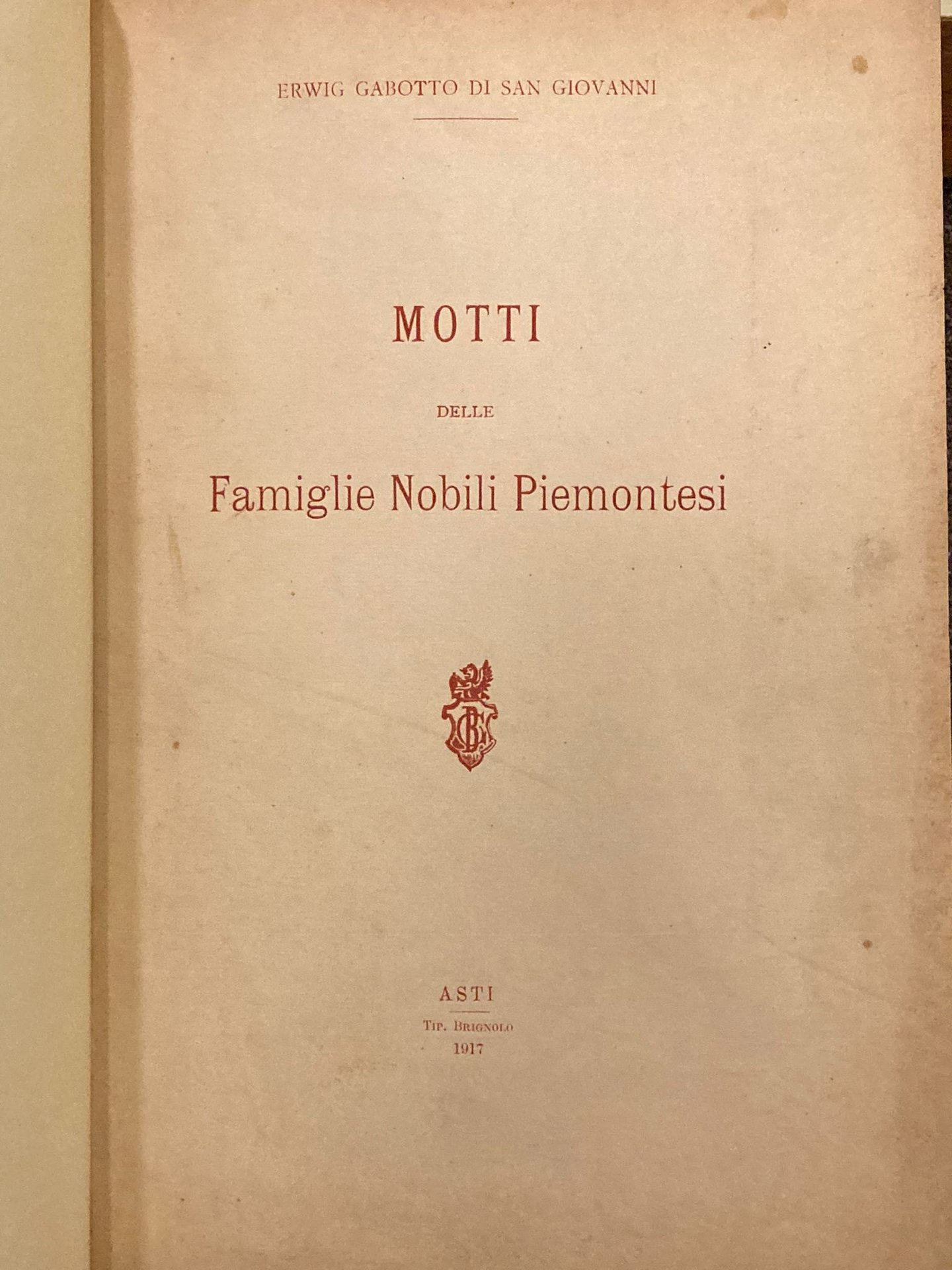 In-4°, pp. 114, bella legatura in mezza pergamena con titoloin oro su tassello marrone al dorso, conservata la brossura editoriale. Testo entro filetto rosso. Ottimo esemplare. Unica edizione. Sono riportati 906 motti nobiliari piemontesi. In fine, utile indice alfabetico dei cognomi. Spreti, 1610.