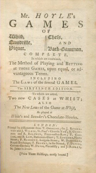 In-16 p. (mm. 160 x 92), p. pelle coeva (restaur.), in astuccio mod., pp. XII,216. The sixteenth edition. To which are added, two new cases at "whist"; also the new laws of the game at "whist", as played at White's and Saunders's Chocolate-Houses, and also a Dictionary for "whist" which resolves almost all the critical cases that may happen at the game. To which is added an artificial memory': or an easy method of assisting the memory of those that play at the game of "whist". Questo trattato è un classico del suo genere che ebbe numerosiss. ediz., sovente in forme modificate, fino al XX secolo. L'A., lo scrittore inglese Edmond Hoyle (1672-1769), era considerato un'autorità nell'ambito dei giochi con le carte. Il suo famoso breve trattato sul gioco del "whist" (stampato per la prima volta nel 1742), fu presto seguito da manuali su altri giochi e nel 1748 furono amalgamati in un'opera completa.Qualche pagg. ingiallita altrimenti esemplare ben conservato. Raro.