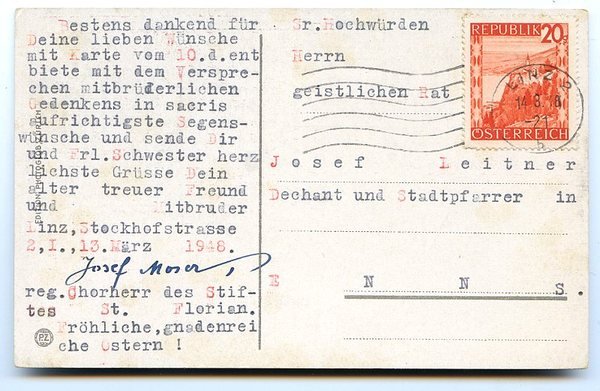 1 S. Qu.-8vo. Mit ms. Adresse und einigen Beilagen (s. u.). An Josef Leitner, Dechant und Stadtpfarrer in Enns mit Wünschen für ein schönes Osterfest. - Josef Moser war Chorherr von Stift St. Florian und Abgeordneter der Christlichsozialen Partei im Bundesrat. - Beiliegend eine gedr. Einladung zur 36. Wiener Männerfahrt nach Mariazell (1928), zwei gedr. Einladungen zur Verleihung von Auszeichnungen an Pater Heinrich Abel (1843 bis 1926) sowie eine gedr. Karte zum Gedächtnis an denselben.