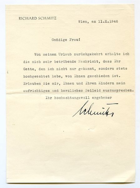 ½ S. auf Doppelblatt. Gr.-8vo. An Charlotte Seefehlner zum Ableben Ihres Gatten, Baurat Egon Ewald Seefehlner (geb. 1874), eines Eisenbahnfachmanns und Elektrotechnikers und ehemaligen Generalidrektors der Österreichischen Bundesbahnen. - Richard Schmitz war von 1934 bis 1938 nach der Verhaftung seines sozialdemokratischen Vorgängers durch den Ständestaat der letzte Bürgermeister Wiens vor dem Anschluß an das Deutsche Reich. "In dieser Zeit ließ er unter anderem die Wiener Höhenstraße errichten. Während des Zweiten Weltkrieges saß er sieben Jahre lang in politischer Haft in Reichenau. Nach Ende des Krieges wurde Richard Schmitz Generaldirektor des Herold-Verlages" (Wikipedia). - Auf Briefpapier mit gedr. Briefkopf.