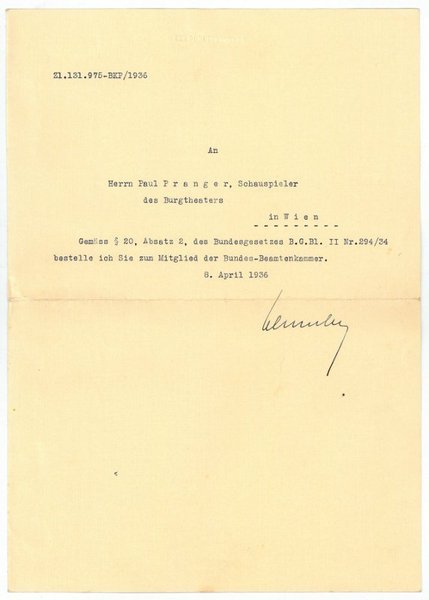 ½ S. Folio. An den Schauspieler Paul Pranger (1888-1961): "Gemäß § 20, Absatz 2, des Bundesgesetzes B. G. Bl. II Nr. 294/34 bestelle ich Sie zum Mitglied der Bundes-Beamtenkammer […]". - Kurt Schuschnigg war während der Zeit des von ihm als Justizminister mitkonzipierten austrofaschistischen "Ständestaates" von 29. Juli 1934 bis 11. März 1938 diktatorisch regierender Bundeskanzler des Bundesstaates Österreich. Ab 1936 übernahm Schuschnigg auch die Führung der österreichischen Einheitspartei Vaterländische Front und hielt den Titel "Bundeskanzler und Frontführer". Paul Pranger war seit 1919 Ensemblemitglied des Wiener Burgtheaters. - Auf Briefpapier mit gepr. Briefkopf "der Bundeskanzler".