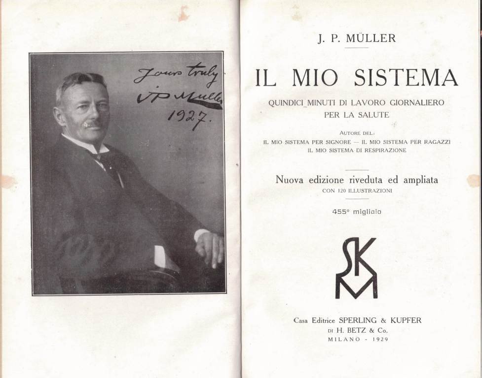 J. P. (Jorgen Peter) Muller, Il mio sistema. Quindici minuti di lavoro giornaliero per la salute. Autore del: Il mio sistema per signore – Il mio sistema per ragazzi – Il mio sistema di respirazione, Casa Editrice Sperling e Krupfer di H. Betz e Co., Milano 1929, nuova ed. riveduta ed ampliata, ill. b.n., cm 23, legatura in mezza tela marrone con titoli manoscritti al dorso e angoli. Segnatura di collocazione a margine dell’occhiello. Lievissima abrasione alle cuffie, minime fioriture, per il resto ottimo.