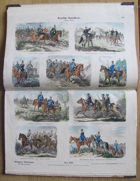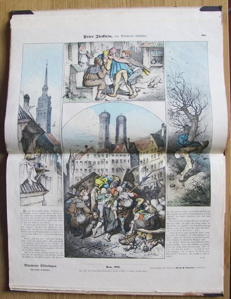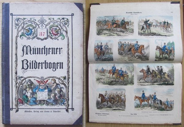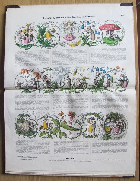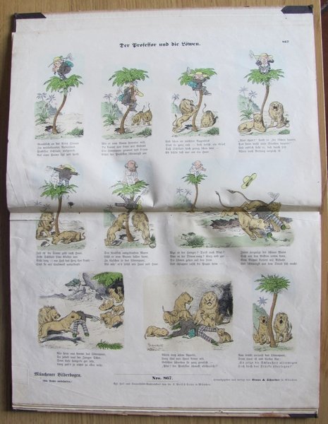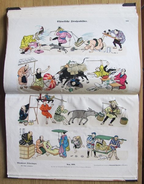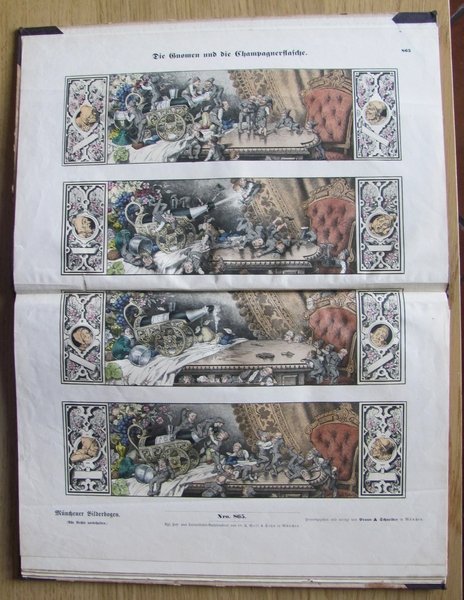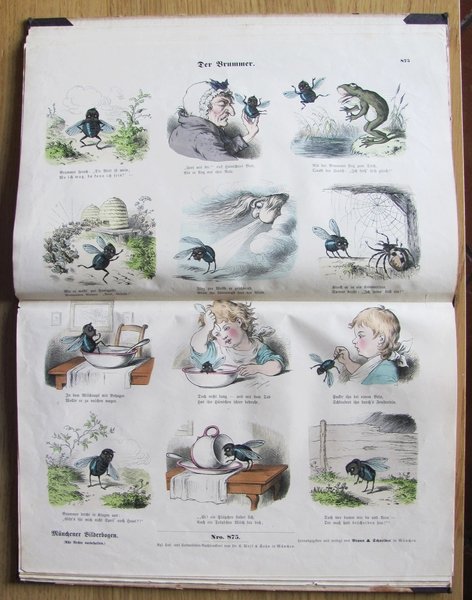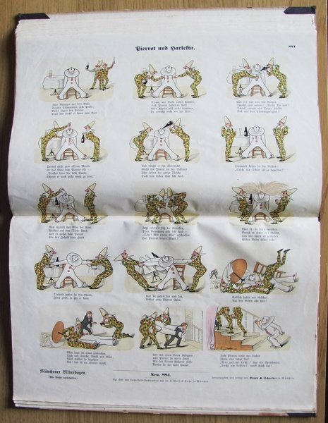 18 Tavole dal N.865 al N.888 tutte a doppia pagina a colori tipo ?Imagerie d?Epinal? di vari illustratori tra i quali notiamo: Meisenbach, Reinicke, H. Braun, Alfred Schmidt, Ph. Sporrer, L. Meggendorfer, Job. Gehrts ed altri. Verlag von Braun & Schneider - Munchen, 1888 ca. Cartonato editoriale con dorso in tela originale. 23x34,5. Molto Raro e in Buonissimo stato. , Molto buono (Very Good)