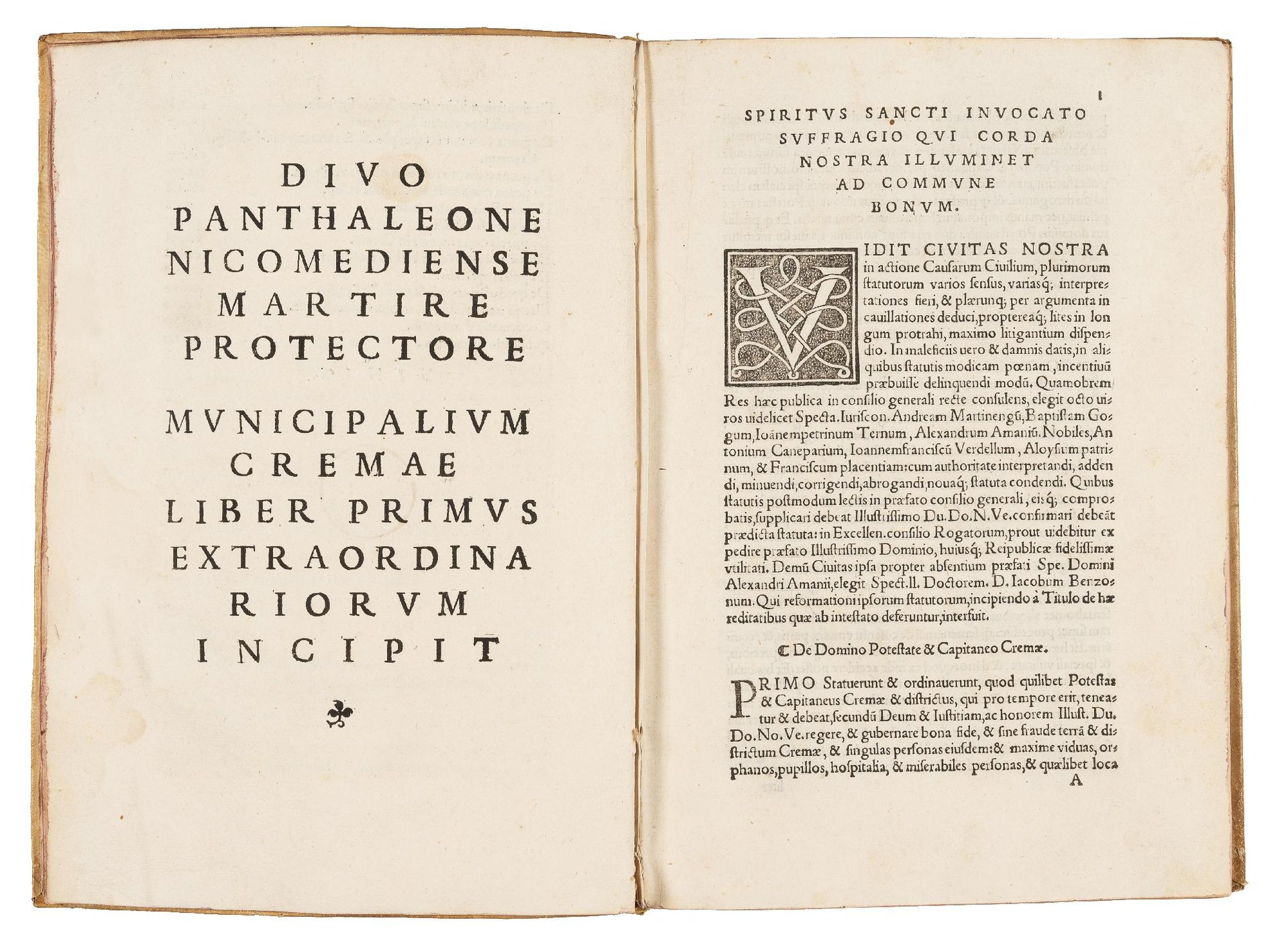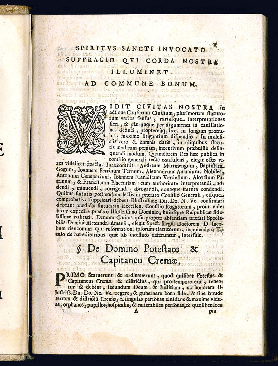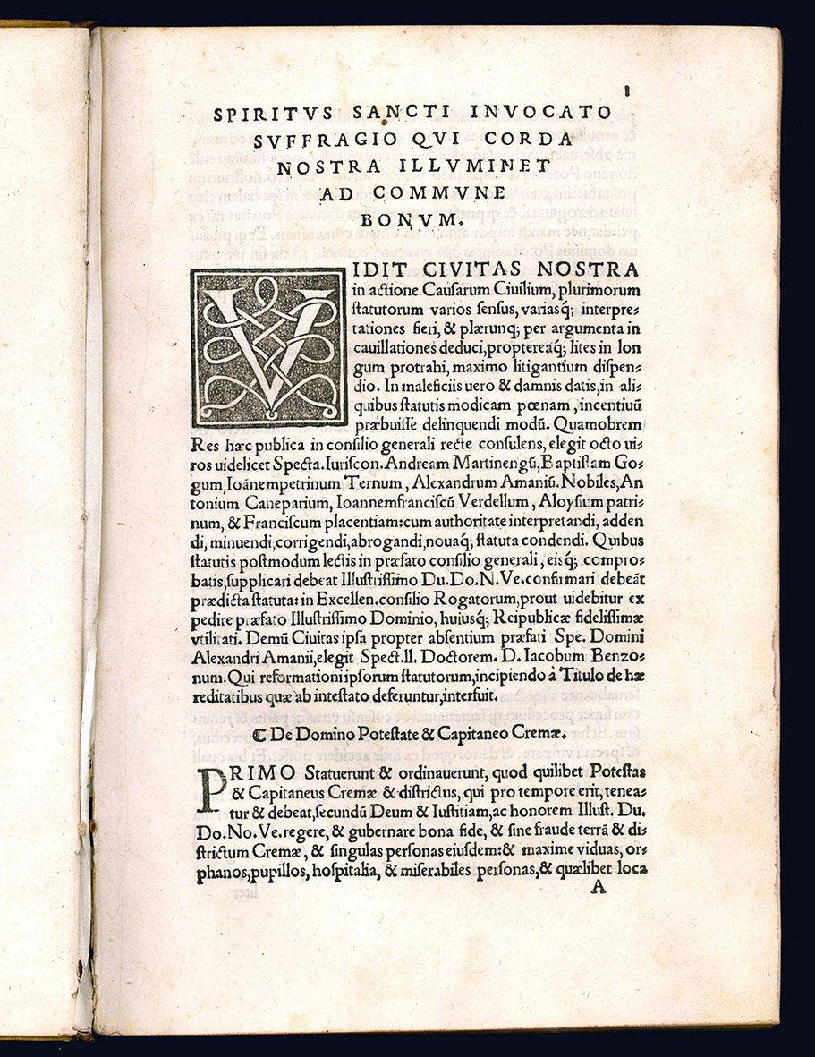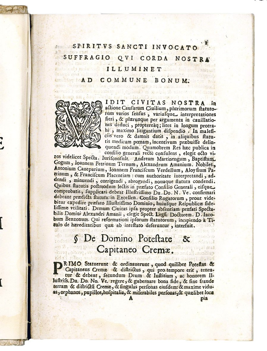RARA EDIZIONE ORIGINALE della revisione cinquecentesca degli statuti delle città di Crema, che erano stati approvati nel 1483 e stampati per la prima volta a Brescia nel 1484. Il testo è suddiviso in cinque parti: I - Extraordinariorum; II - Civilium causarum; III - Criminalium; IV - Damnorum datorum; V – Victualium.
