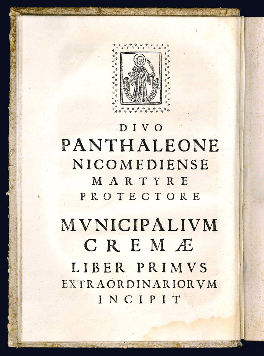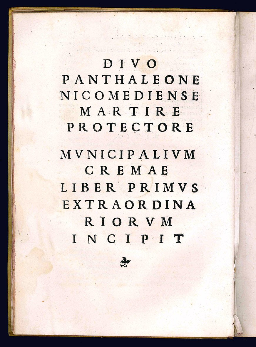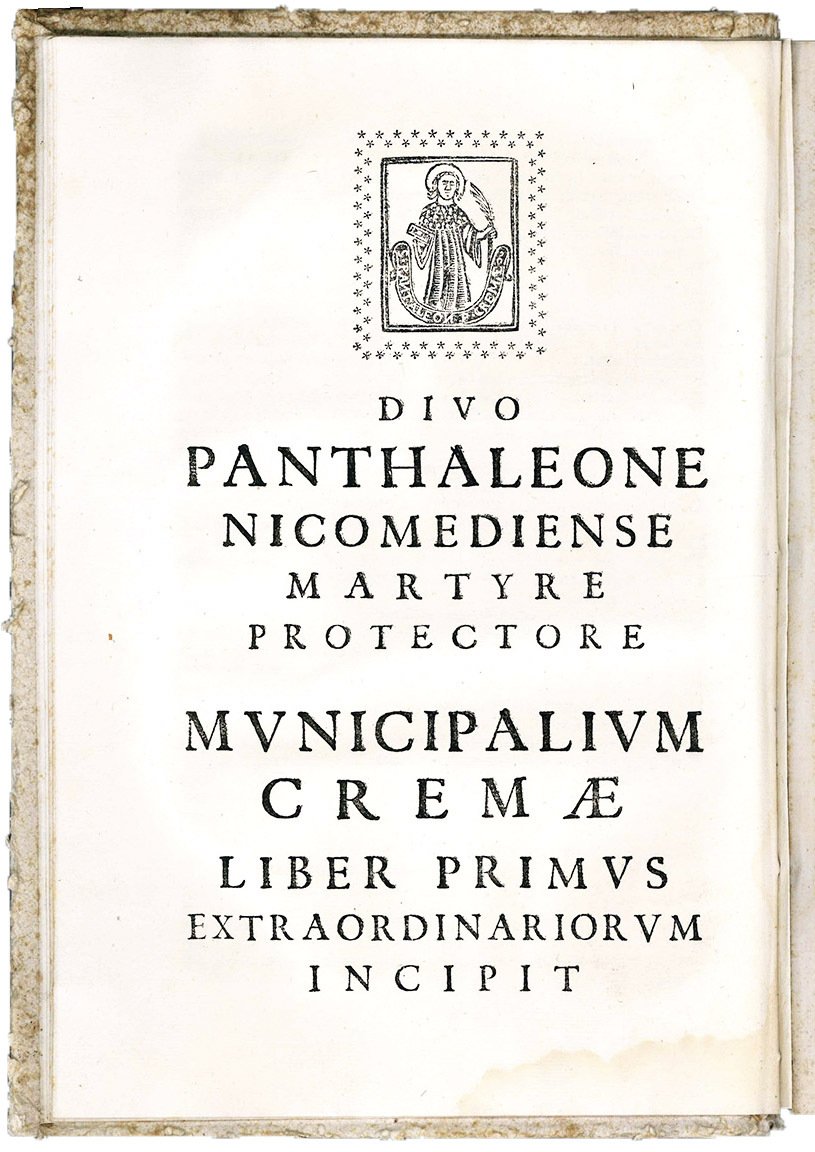 In folio (mm. 280x194). Cc. [10], 141. Segnatura: [foglia]10 A4 B-R8 S10. Manca l'ultima carta bianca. Stemma della città di Crema e Leone di San Marco impressi in legno al frontespizio. Piccola figura xilografica raffigurante San Pantaleone, patrono della città, alla carta [foglia]10v. Cartonato coevo cucito alla rustica con nervi passanti e titolo manoscritto al dorso. Traccia di etichetta e nota manoscritta di difficile leggibilità al piatto anteriore: “Al Sig. …”. Lieve alone nel margine inferiore all'inizio e alla fine del volume, per il resto ottima copia fresca e marginosa.